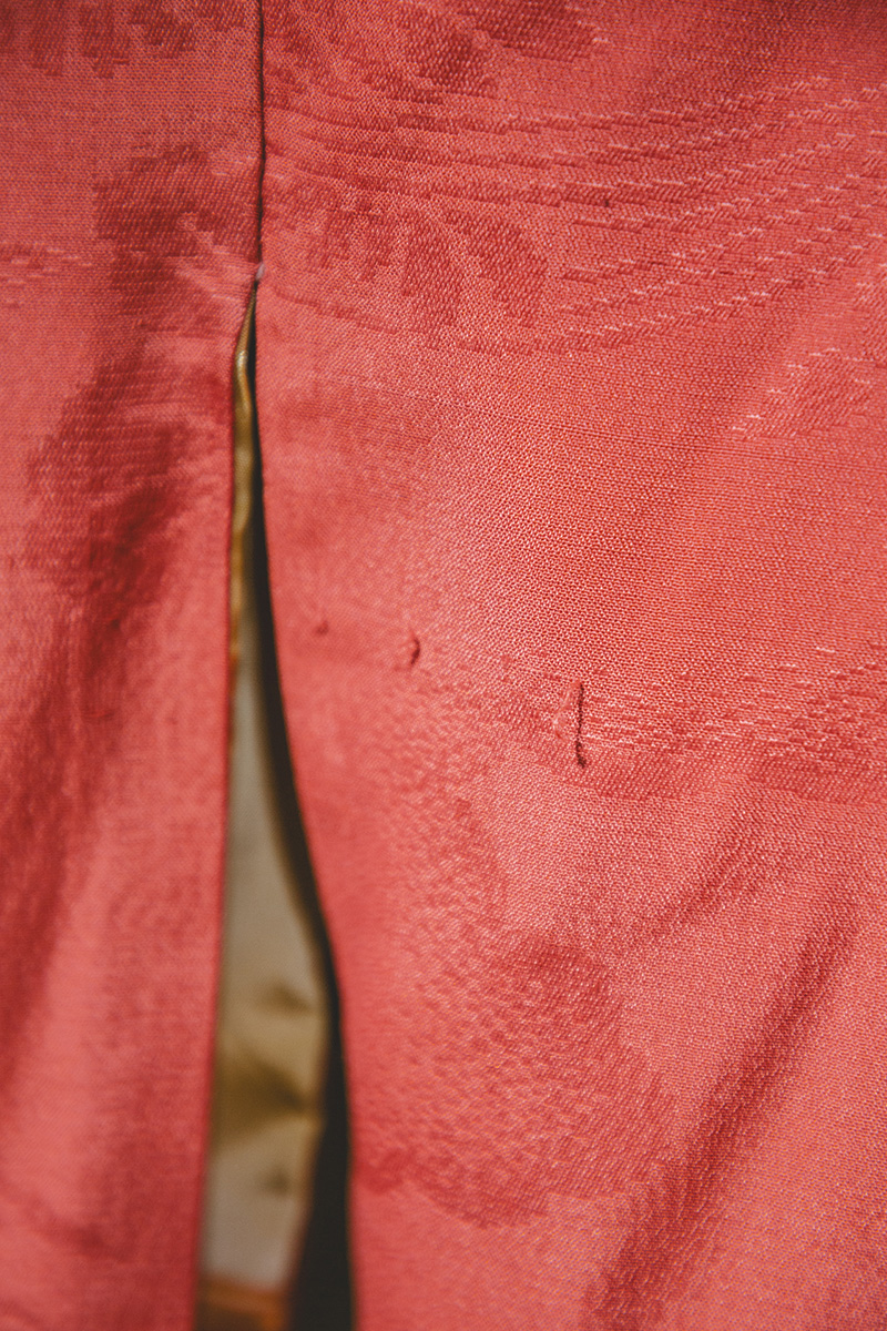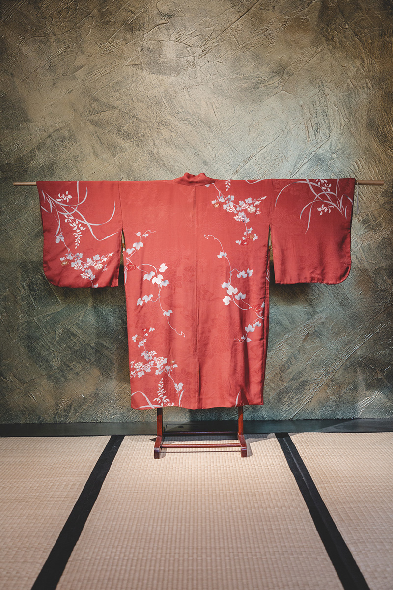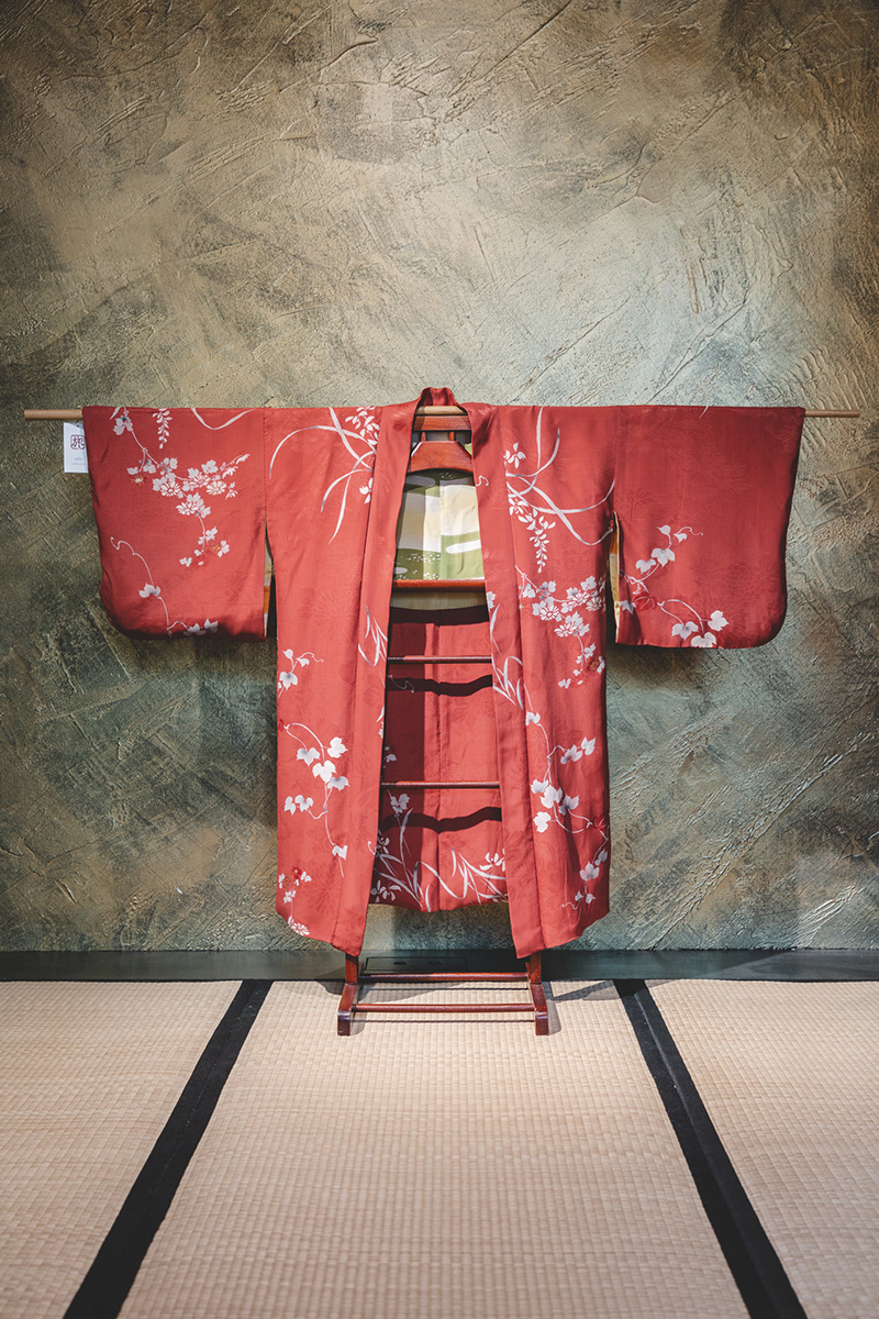 Savenpunainen haori, johon on kuvattu siniharmaita kukkivia köynnöskasveja. Kuvioon on maalattu käsin kultaisia yksityiskohtia. Kangas on pehmeää, sileää ja hieman painavaa. Haorissa on valkoinen vuorikangas, jossa on vihreitä ja oransseja sumupilviä.