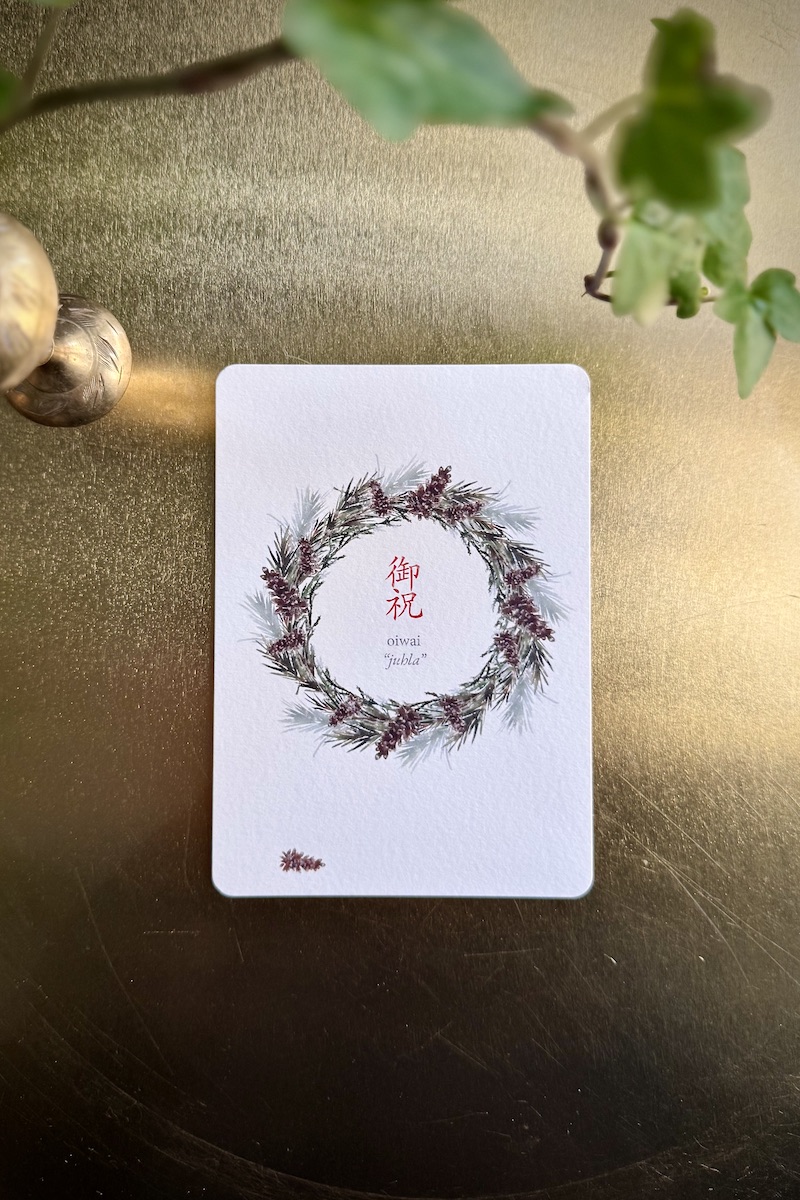 Luonnonläheinen joulu/kutsukortti päällystämättömällä kartongilla. Japanilais-suomalainen kuva-aihe sopii moneen tilaisuuteen. Tekstissä lukee ”juhla” kahdella kielellä, suomeksi ja japaniksi.