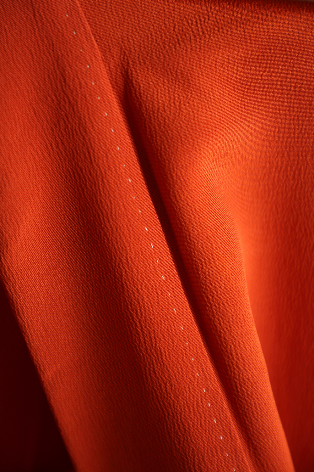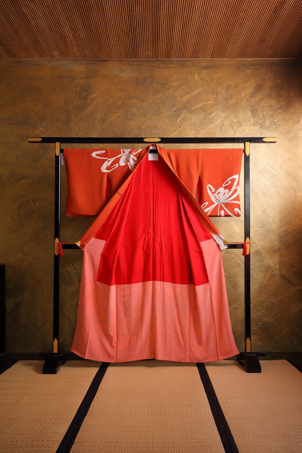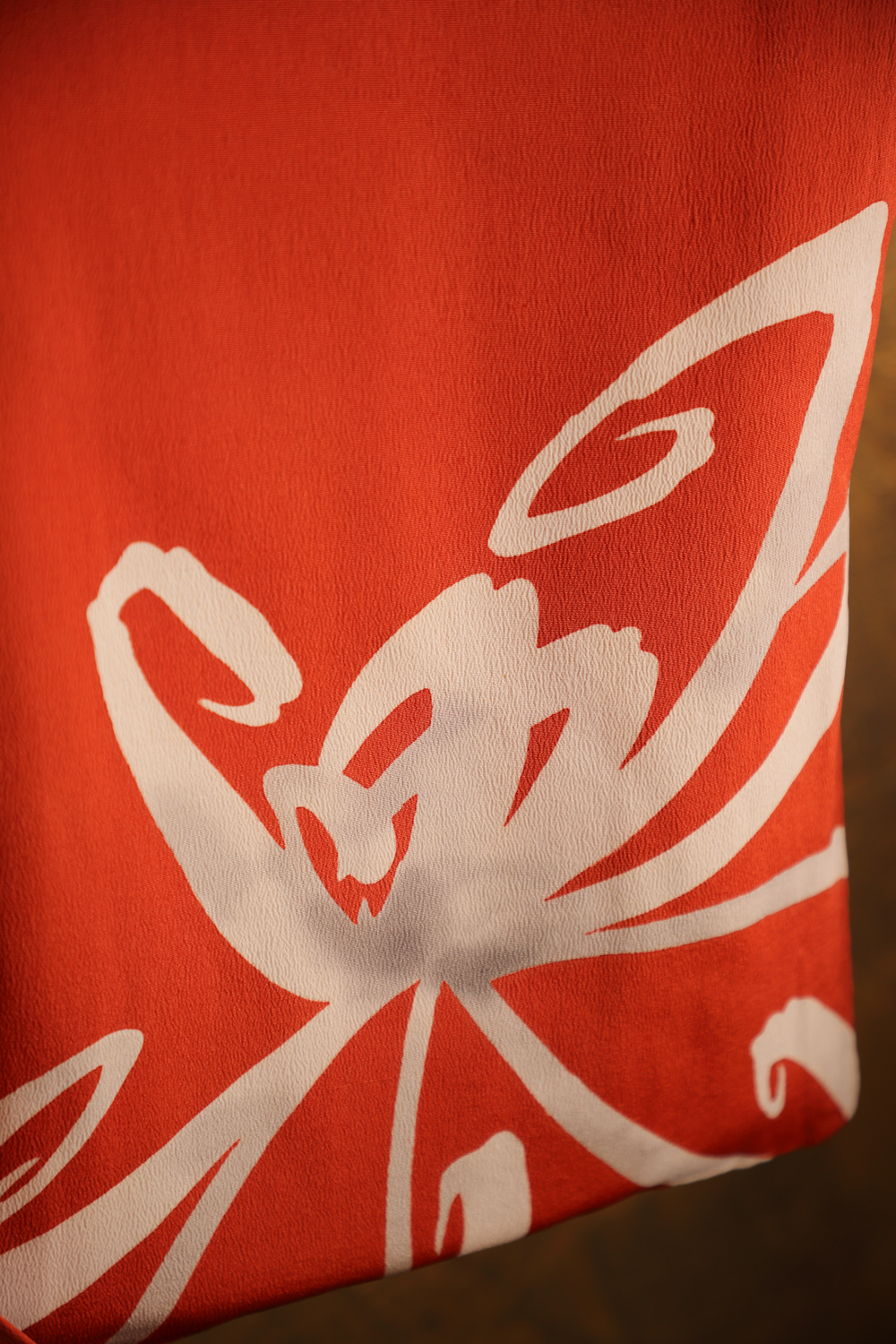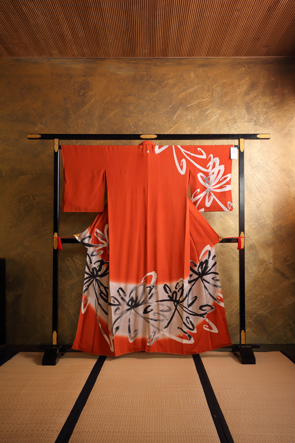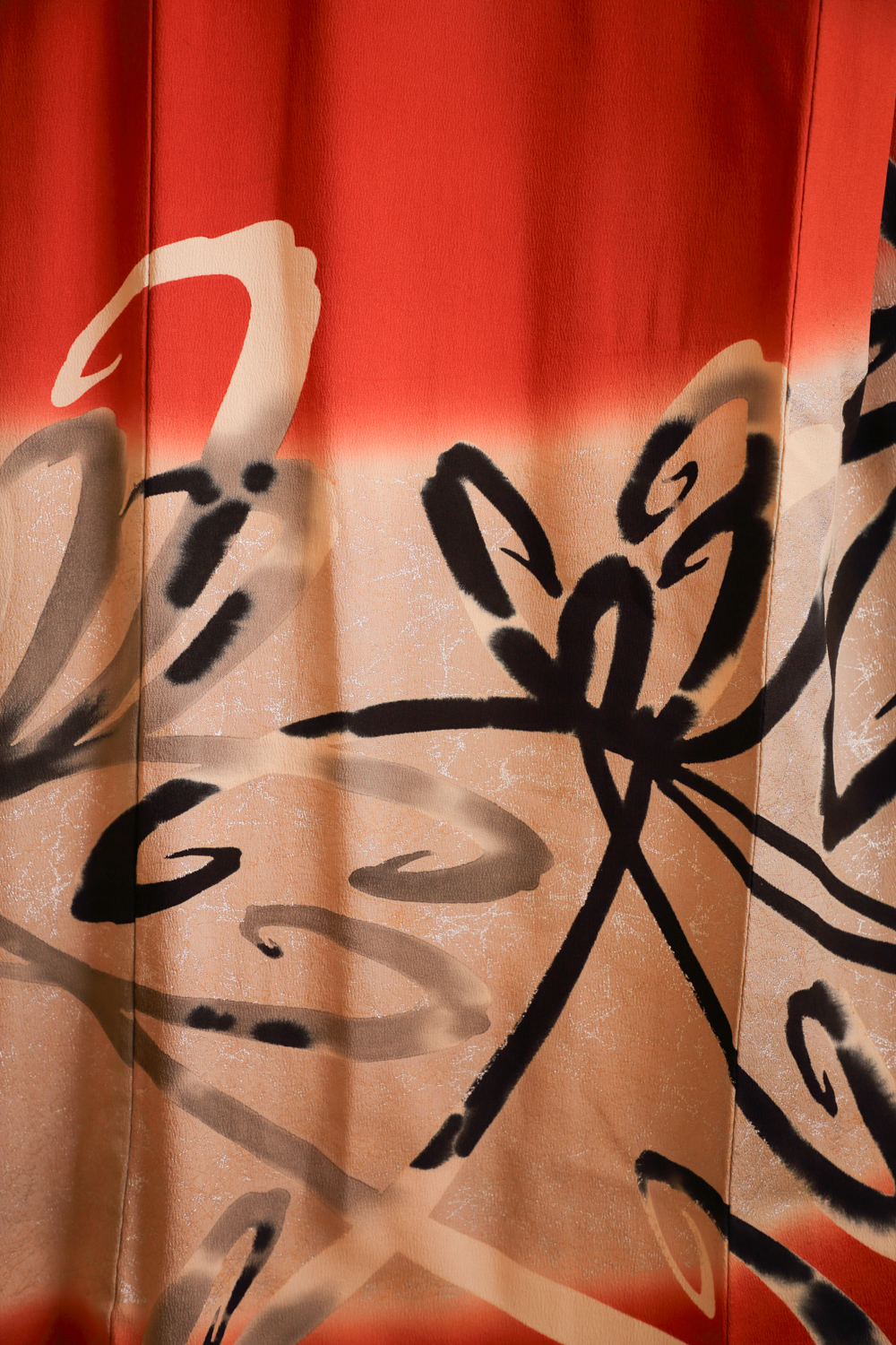 Tiilenpunainen antiikkinen homongi-kimono, jossa on abstrakti ja näyttävä mustavalkoinen kuviointi hopeisilla yksityiskohdilla. Kuvio muistuttaa hieman tyyliteltyä hämähäkkililjaa. Kangas on sileää ja painavaa. Kimonossa on kaksiosainen vuorikangas, jonka yläosa on punaista ja alaosa vaaleanpunaista silkkiä.