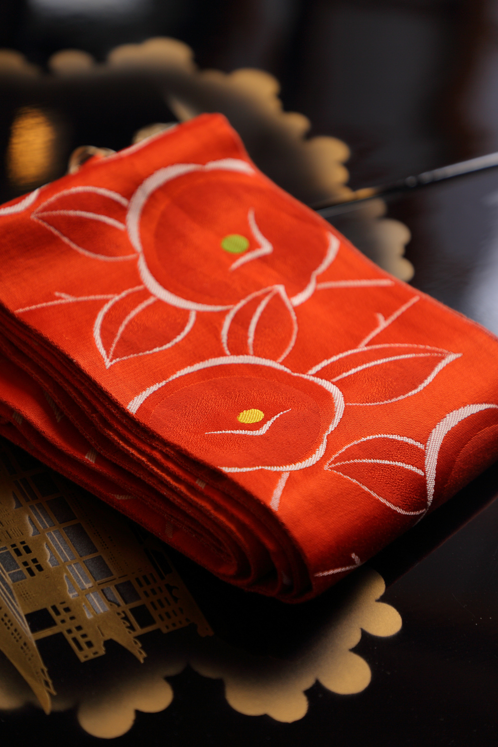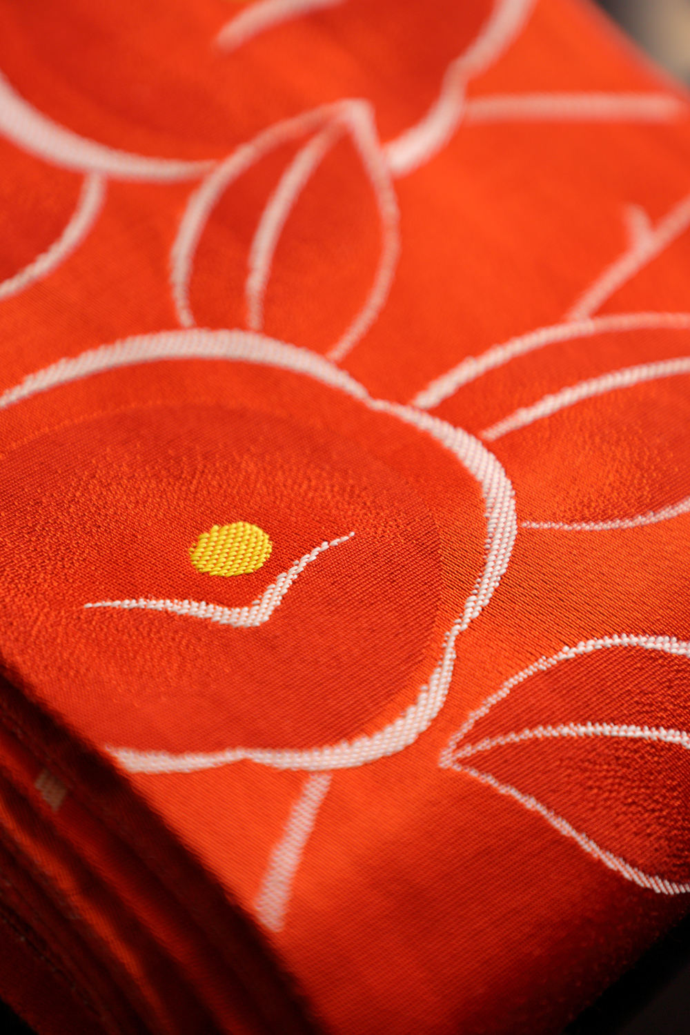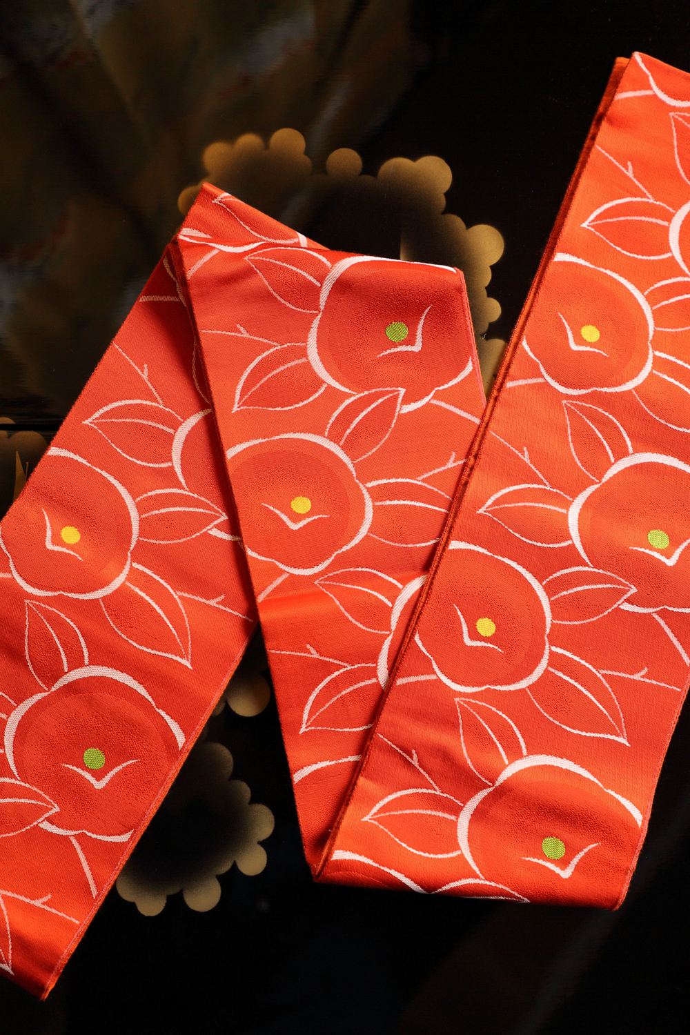 Tumman oranssi hanhaba-obi, johon on kuvattu kamelian kukkia (tsubaki). Obin kääntöpuoli on oranssia kangasta, jossa on klassinen hampunlehtikuvio (asanoha).