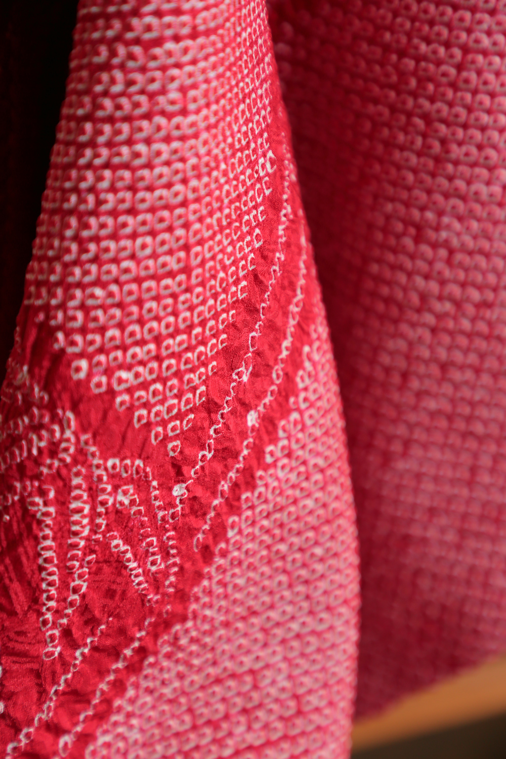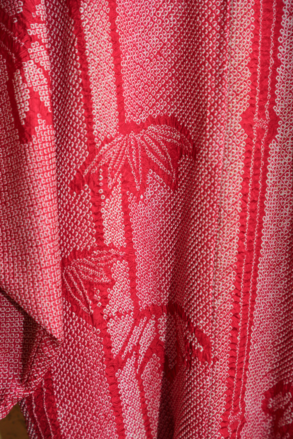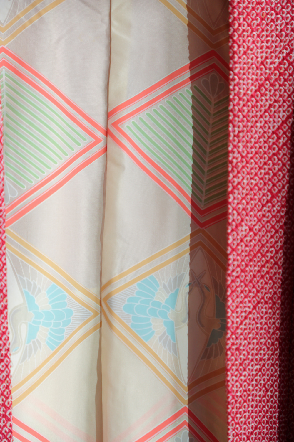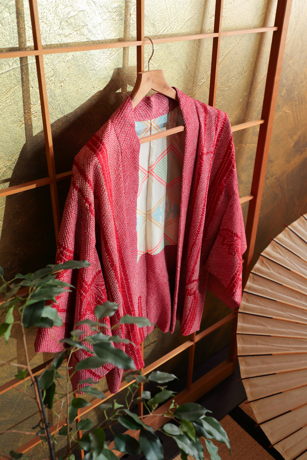 Tummanpunainen solmuvärjätty haori, jossa on pystyraitamainen bambukuvio. Kangas on pehmeää ja kuohkeaa. Haorissa on valkoinen vuorikangas, johon on kuvattu kurkipareja ja männynneulasia vinoneliökuvion sisällä.