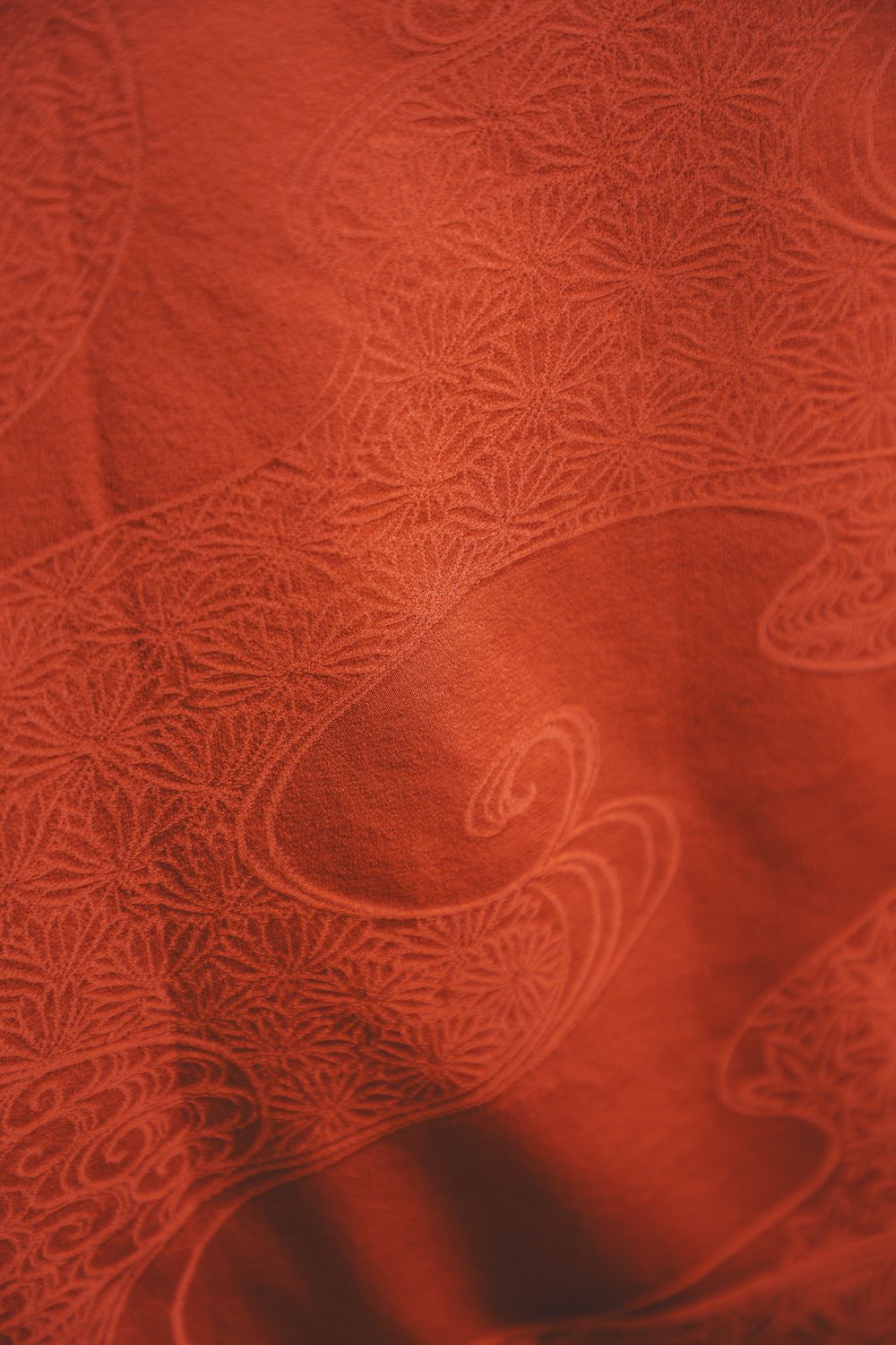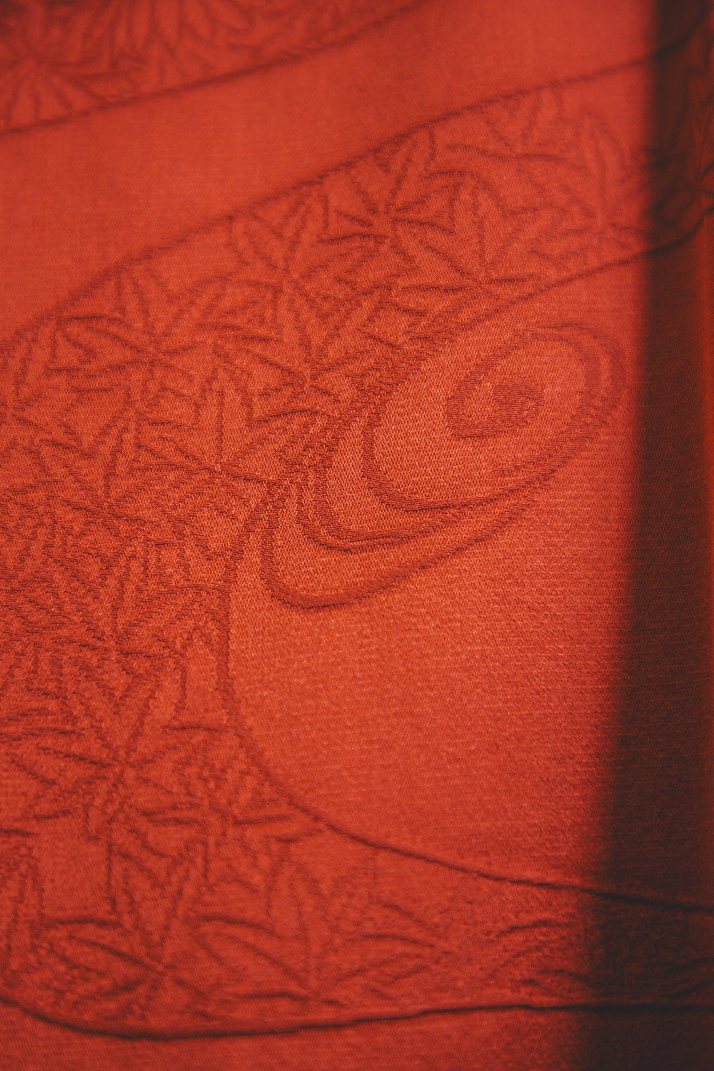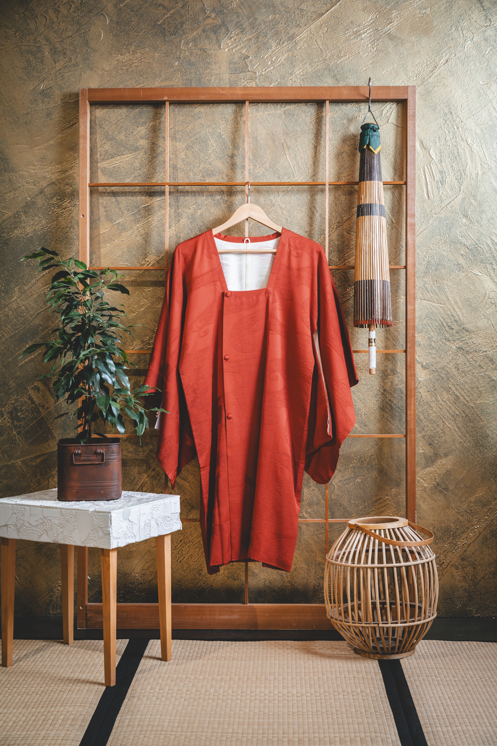 Tummanpunainen michiyuki-jakku, jonka kankaaseen on kudottu virtaavaa vettä esittävä koristeellinen kuviointi. Kangas on sileää ja painavaa. Jakussa on valkoinen vuorikangas, jossa on myös virtauskuvio. Michiyukin etupaneelissa on nepparikiinnitys, ja sen alta löytyy salatasku!
