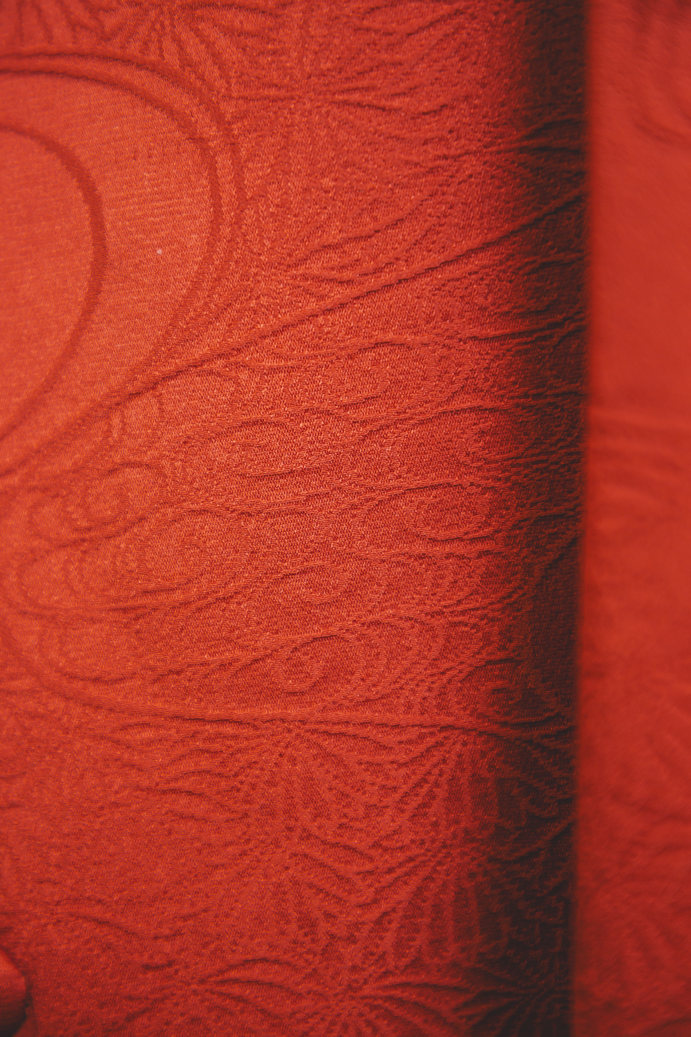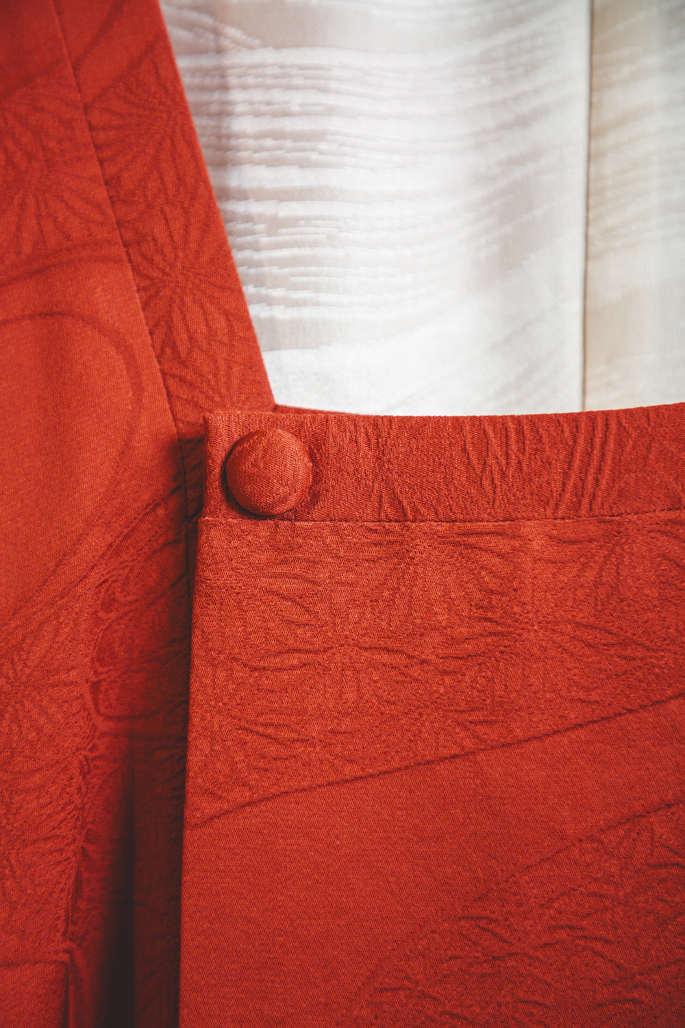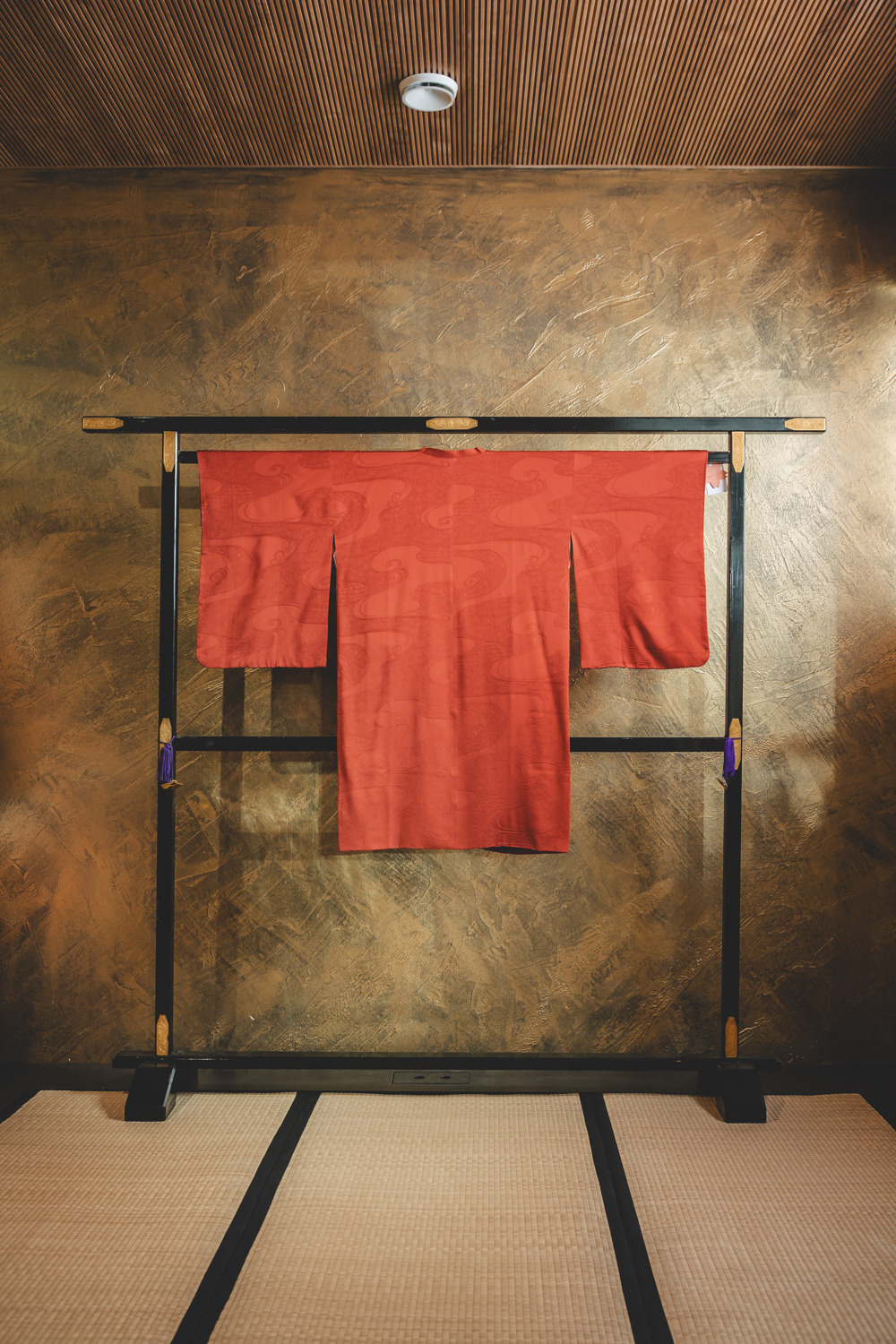 Tummanpunainen michiyuki-jakku, jonka kankaaseen on kudottu virtaavaa vettä esittävä koristeellinen kuviointi. Kangas on sileää ja painavaa. Jakussa on valkoinen vuorikangas, jossa on myös virtauskuvio. Michiyukin etupaneelissa on nepparikiinnitys, ja sen alta löytyy salatasku!