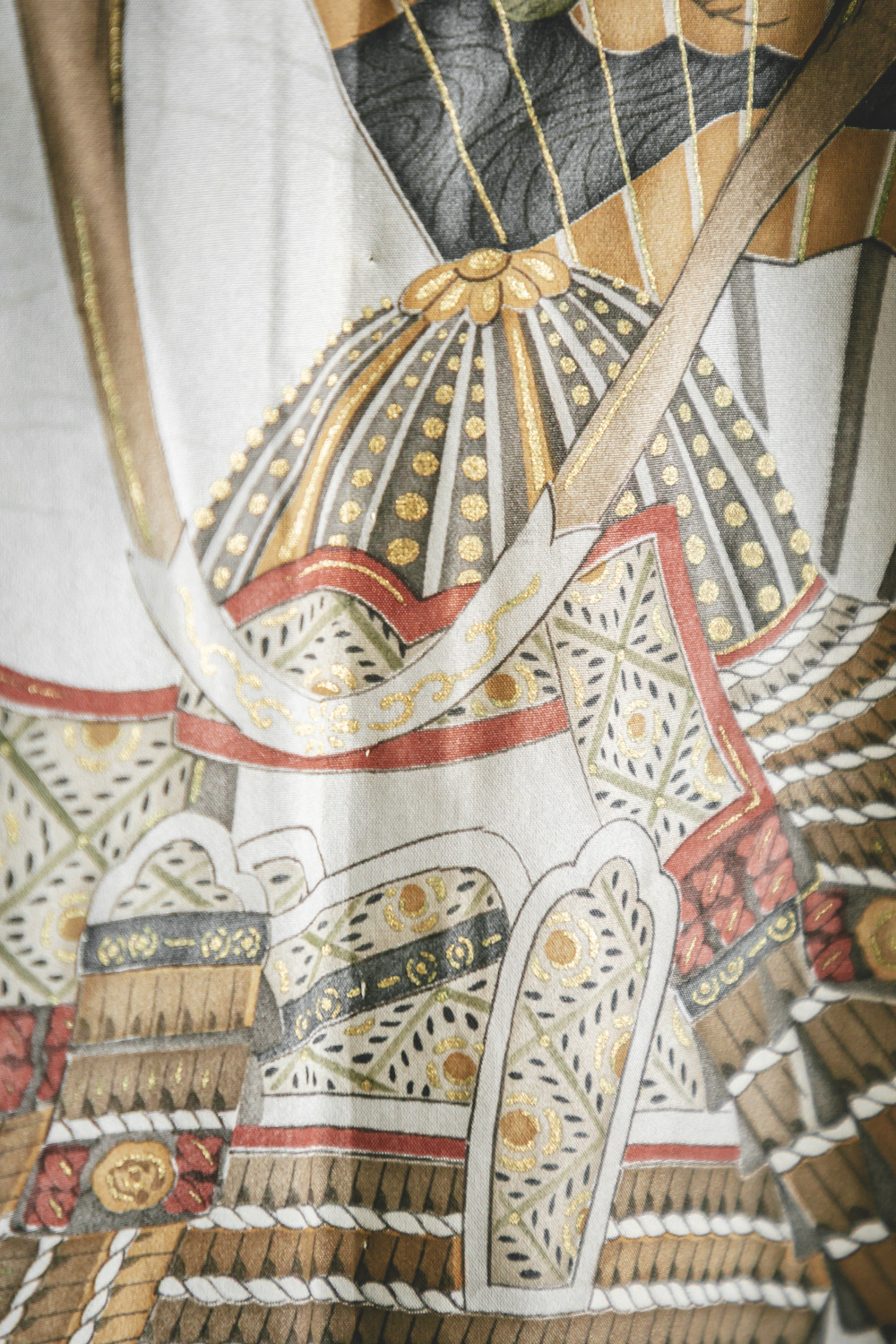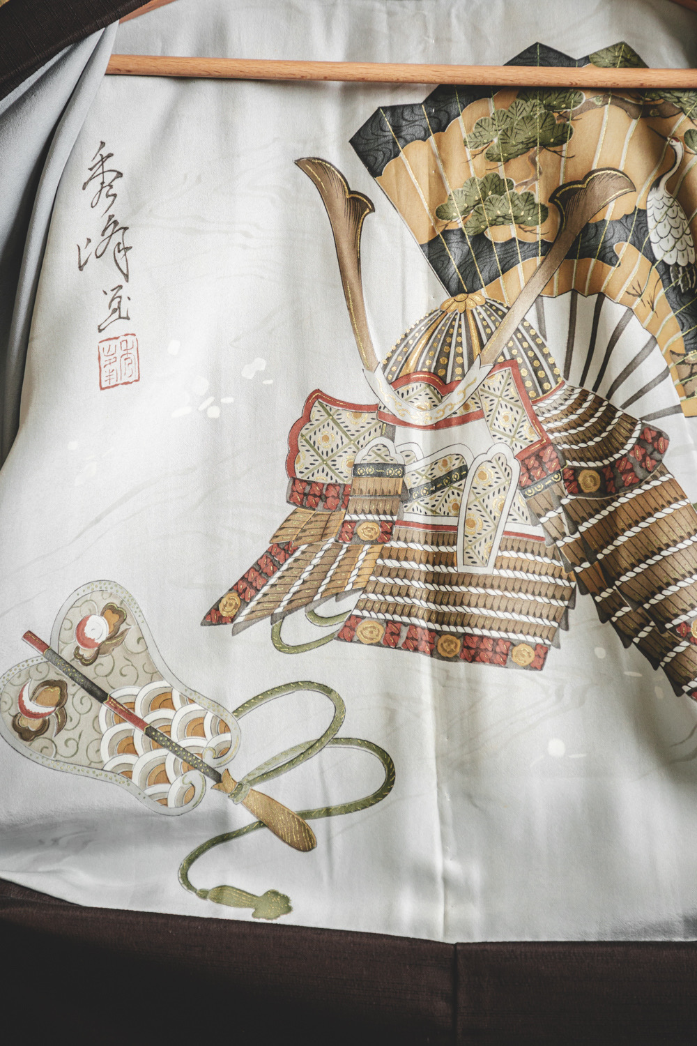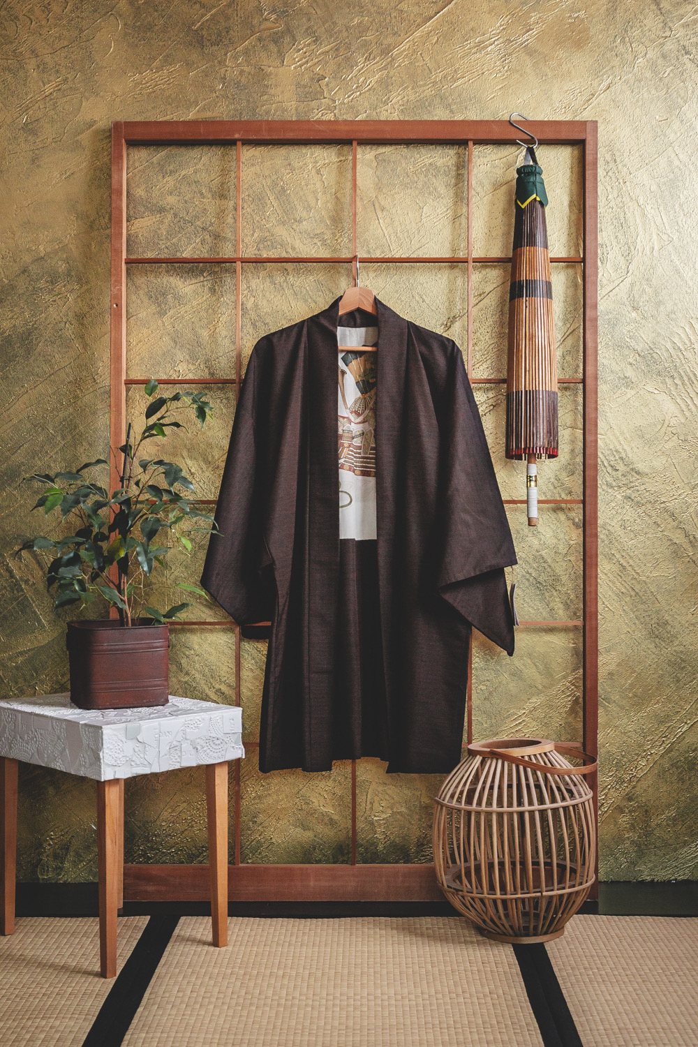 Tummanruskea miesten haori, jonka vuorikankaaseen on kuvattu näyttävä samuraikypärä ja viuhka. Osa kuviosta on maalattu käsin. Päällikankaassa on hieman karkea tekstuuri, mutta se laskeutuu pehmeästi.
