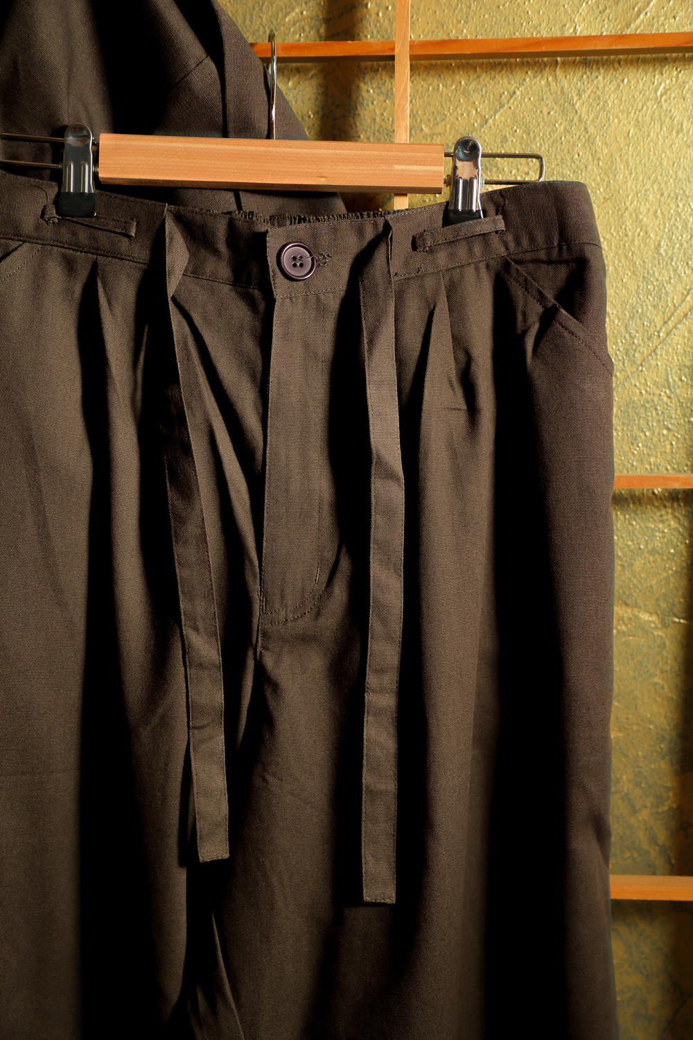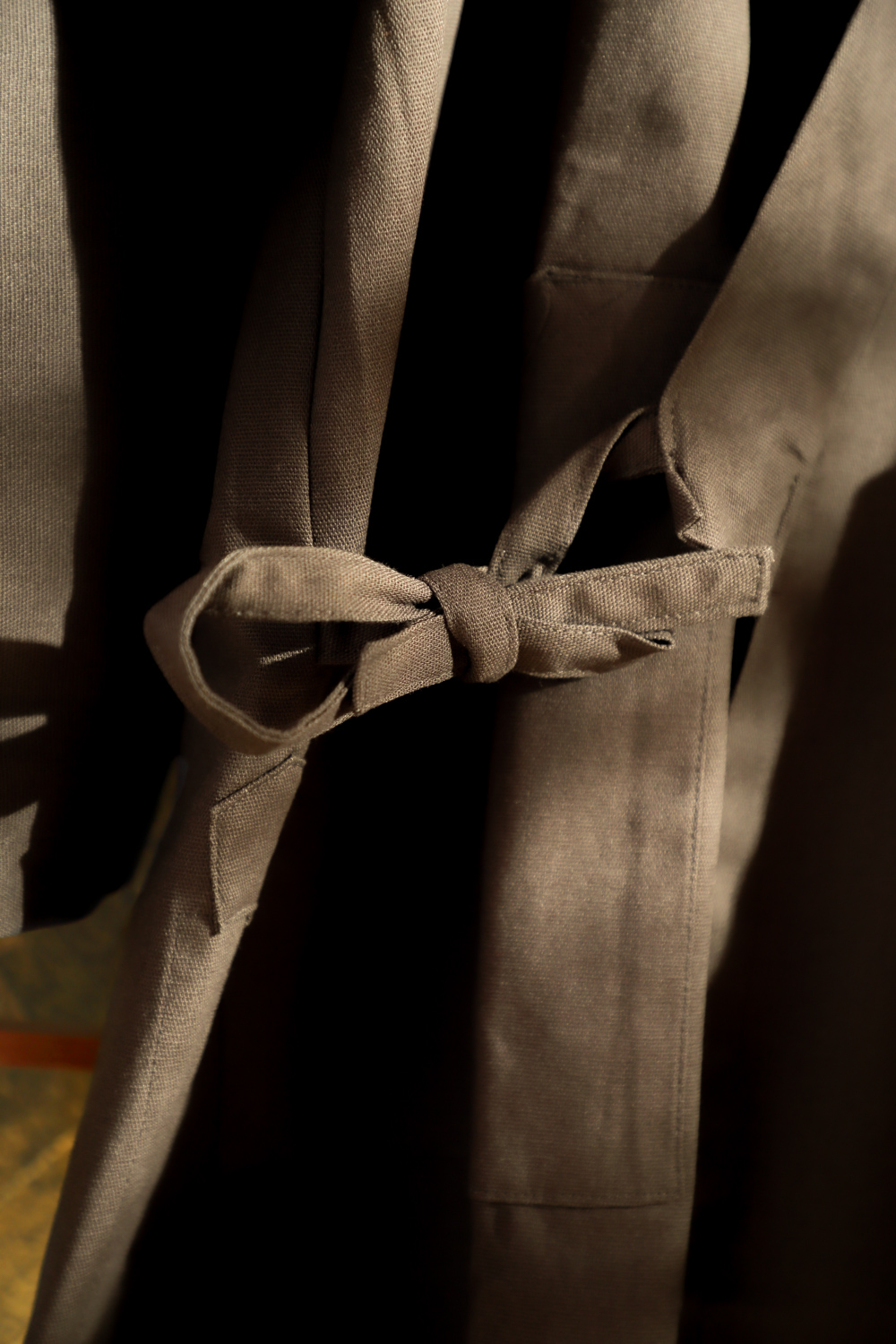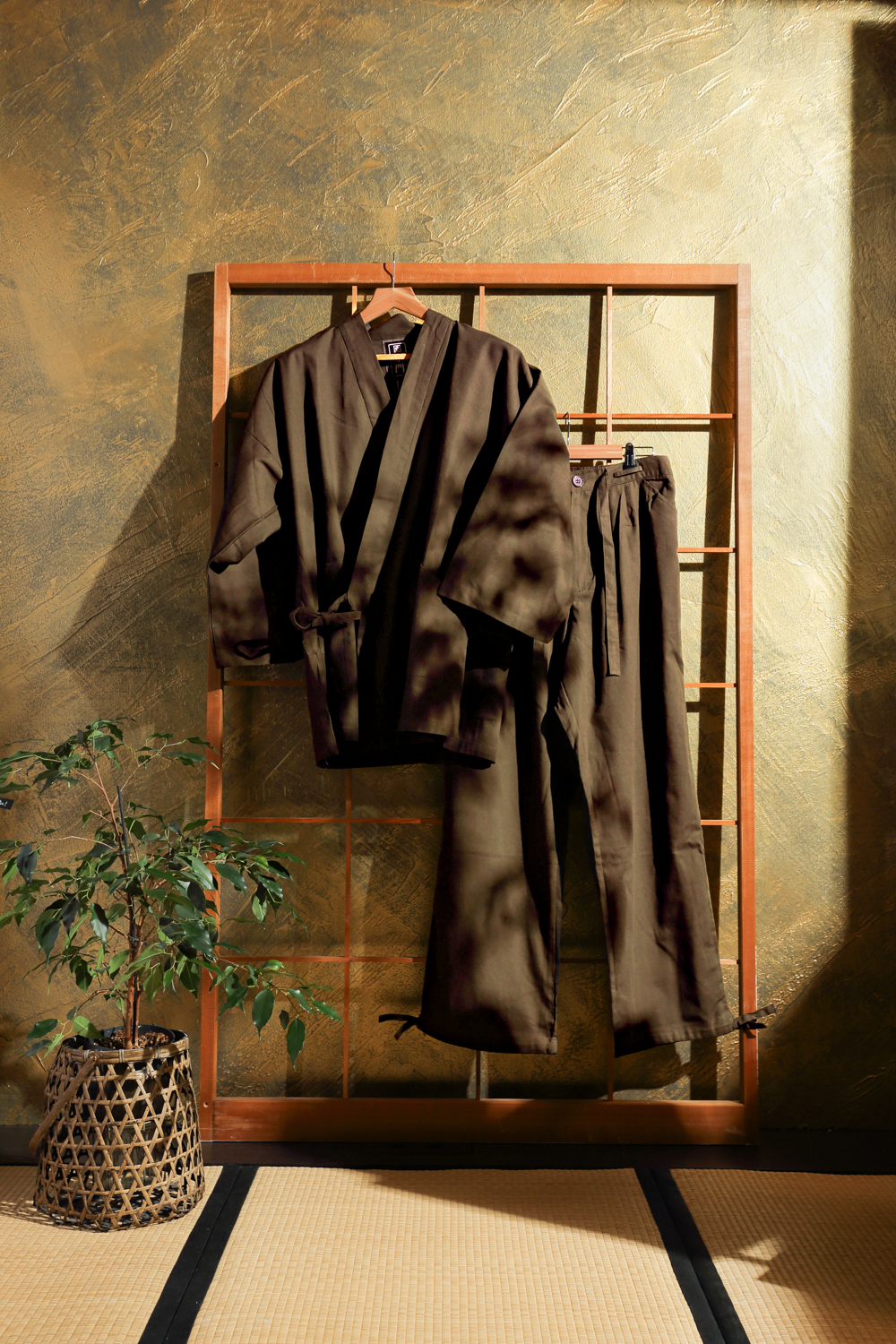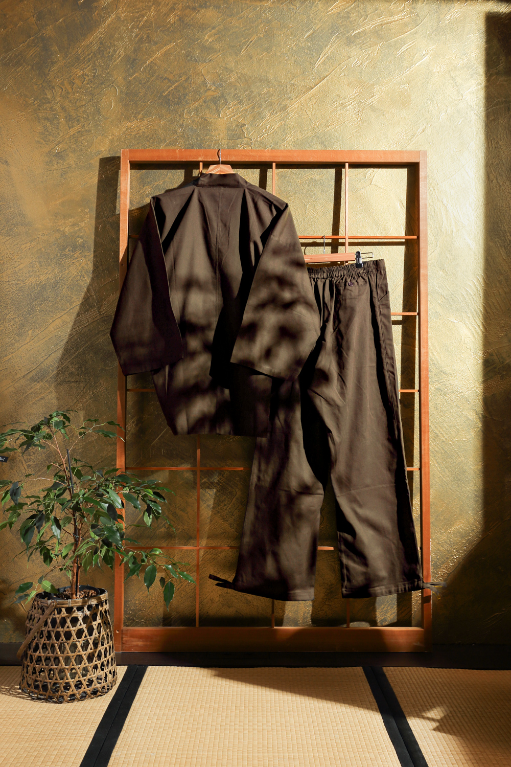 Tummanruskea samue eli työskentelyasu, joka soveltuu hyvin esimerkiksi puutarhatöihin ja kotona oleskeluun. Kangas on pehmeää ja paksuhkoa. Housuissa on kuminauhavyötärö, nappi, vetoketju ja kiristysnauhat. Lahkeensuissa on myös nauhat kiristämistä varten. Takissa on kietaisunauhat, joiden avulla liepeet solmitaan paikoilleen. Takin molemmissa liepeissä on taskut.