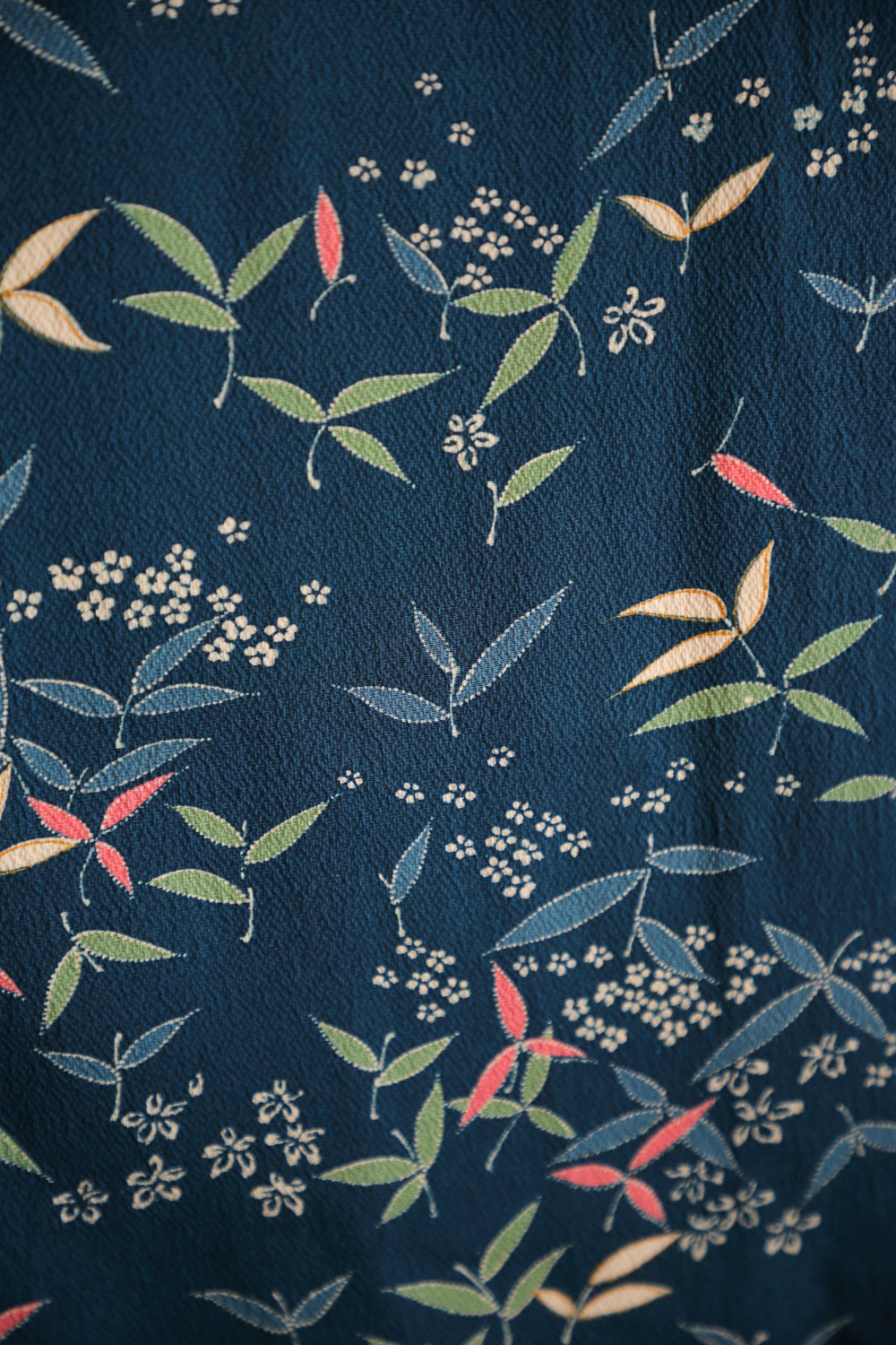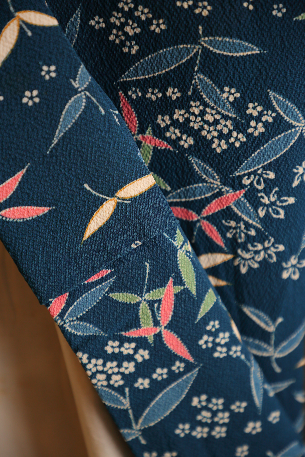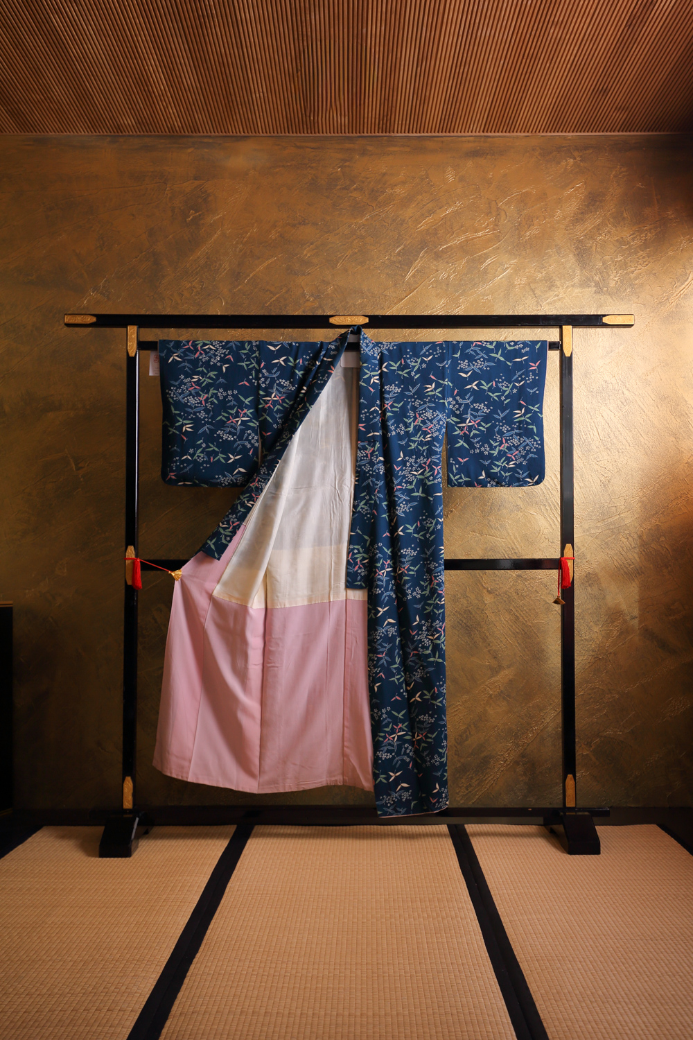 Tummansininen komon-kimono, johon on kuvattu kukkia ja lehteviä kasveja mm. vihreällä ja vaaleanpunaisella. Kangas on pehmeää ja painavaa. Kimonossa on yläosassa valkoinen ja alaosassa vaalean violetti vuorikangas.