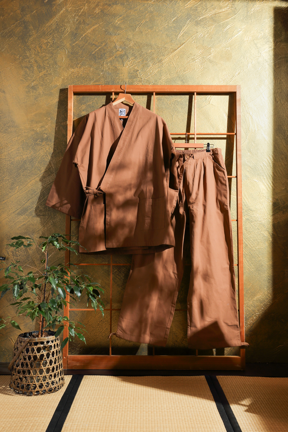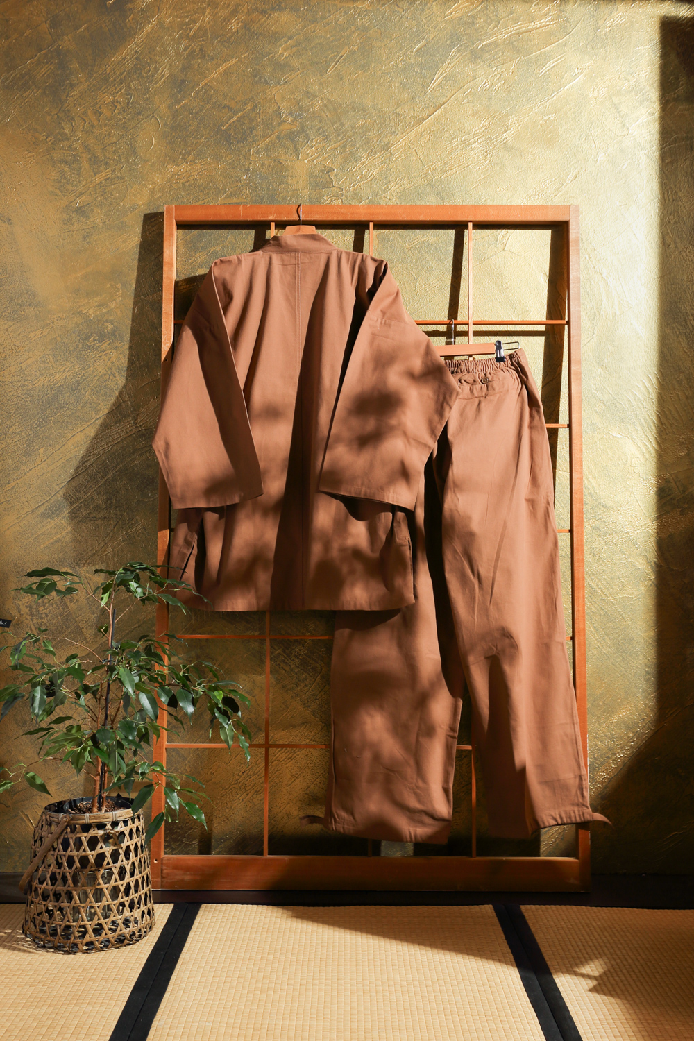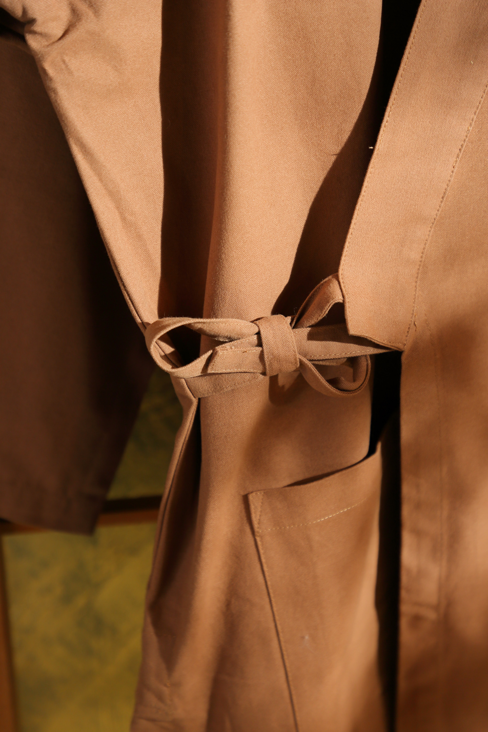 Vaaleanruskea samue eli työskentelyasu, joka soveltuu hyvin esimerkiksi puutarhatöihin ja kotona oleskeluun. Kangas on pehmeää ja paksuhkoa. Housuissa on kuminauhavyötärö, nappi, vetoketju ja kiristysnauhat. Lahkeensuissa on myös nauhat kiristämistä varten. Takissa on kietaisunauhat, joiden avulla liepeet solmitaan paikoilleen. Takin molemmissa liepeissä on taskut.