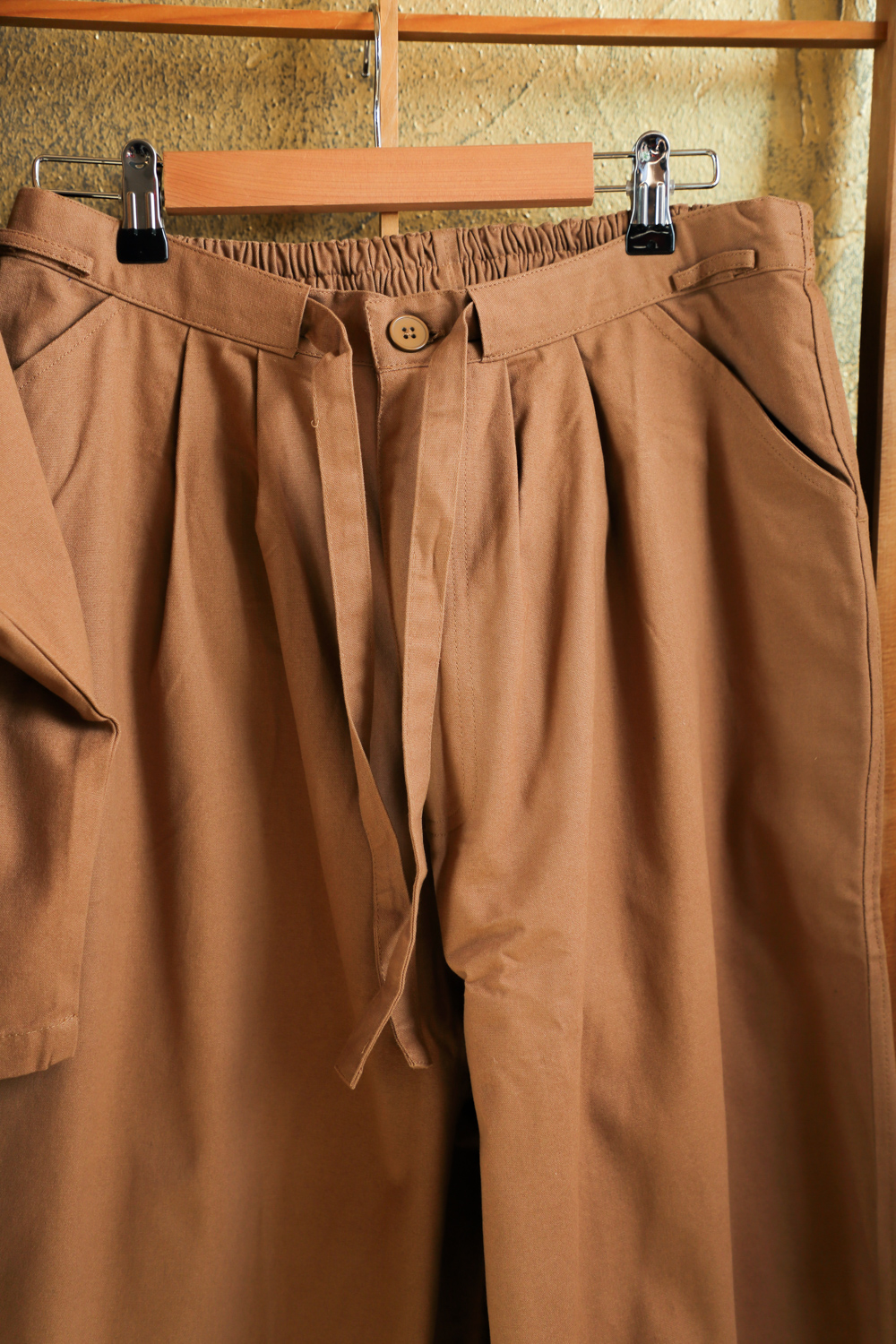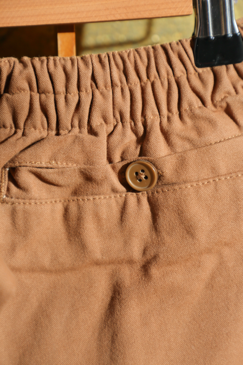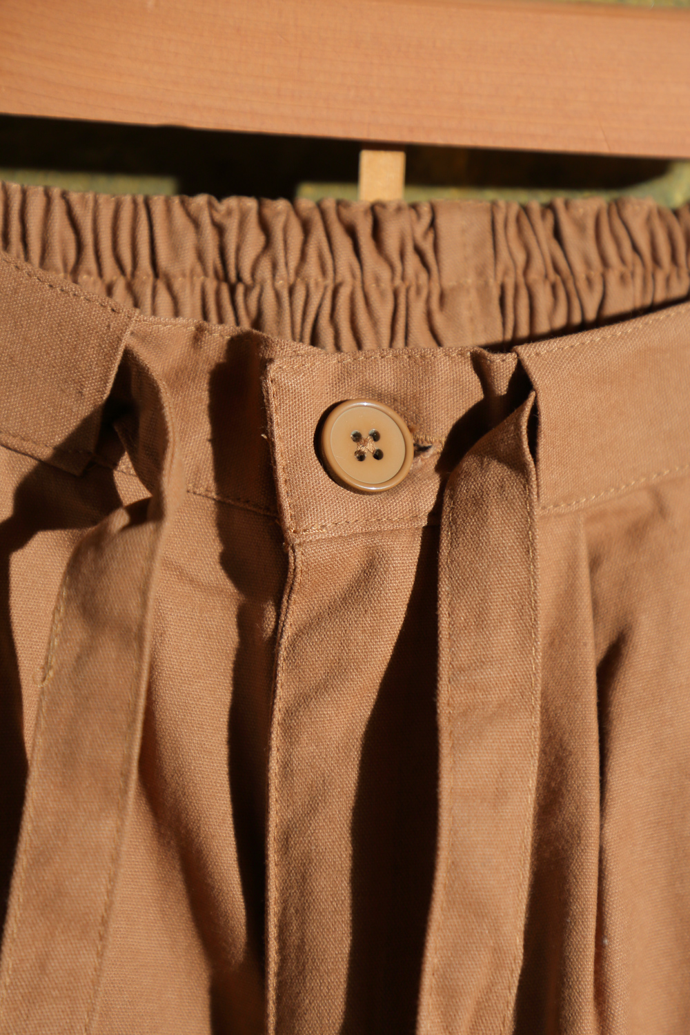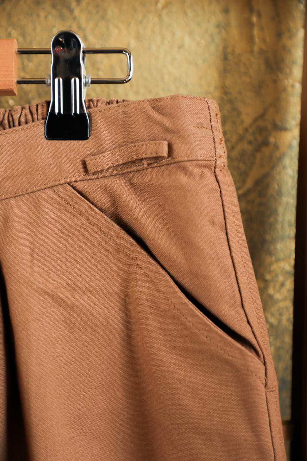 Vaaleanruskea samue eli työskentelyasu, joka soveltuu hyvin esimerkiksi puutarhatöihin ja kotona oleskeluun. Kangas on pehmeää ja paksuhkoa. Housuissa on kuminauhavyötärö, nappi, vetoketju ja kiristysnauhat. Lahkeensuissa on myös nauhat kiristämistä varten. Takissa on kietaisunauhat, joiden avulla liepeet solmitaan paikoilleen. Takin molemmissa liepeissä on taskut.