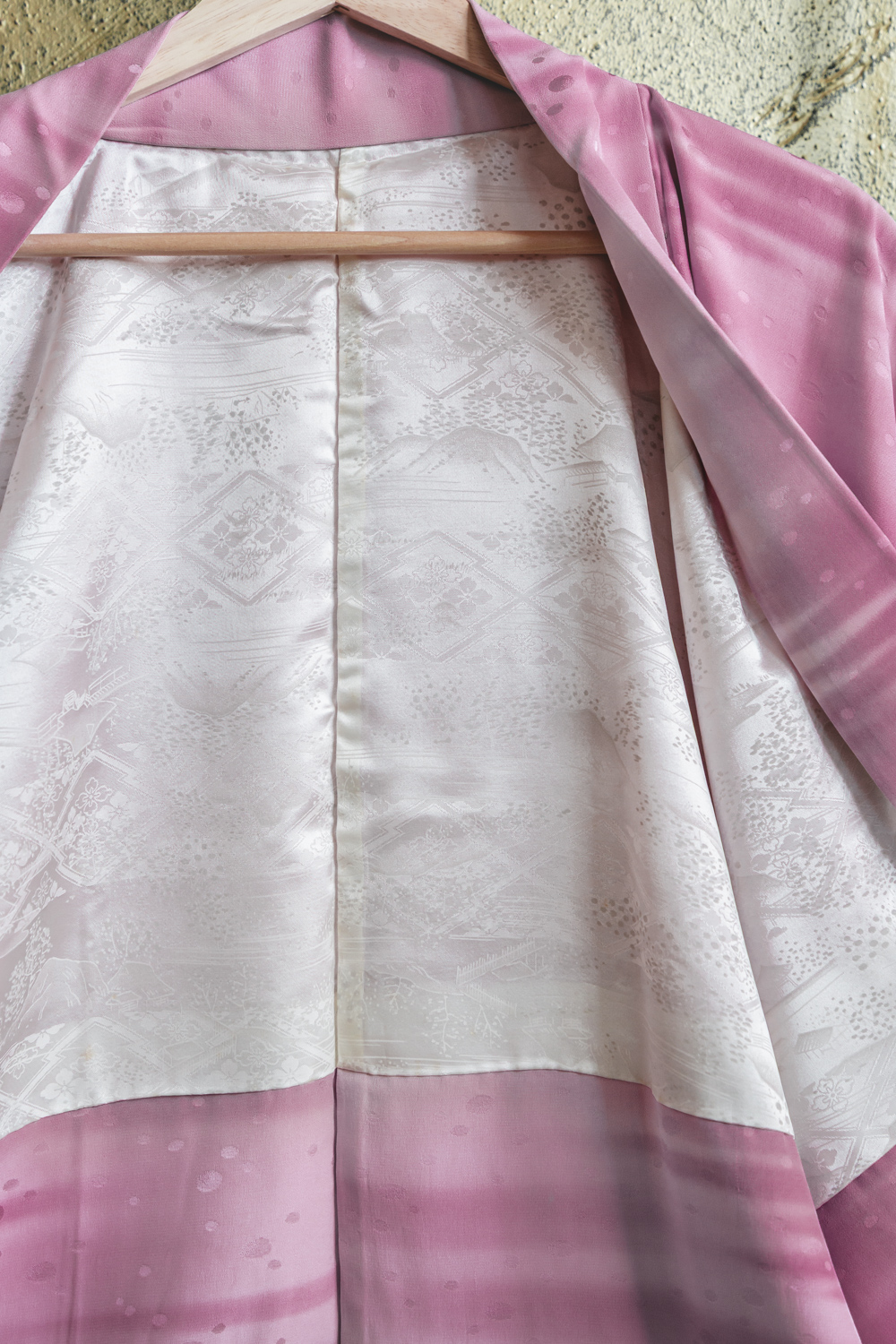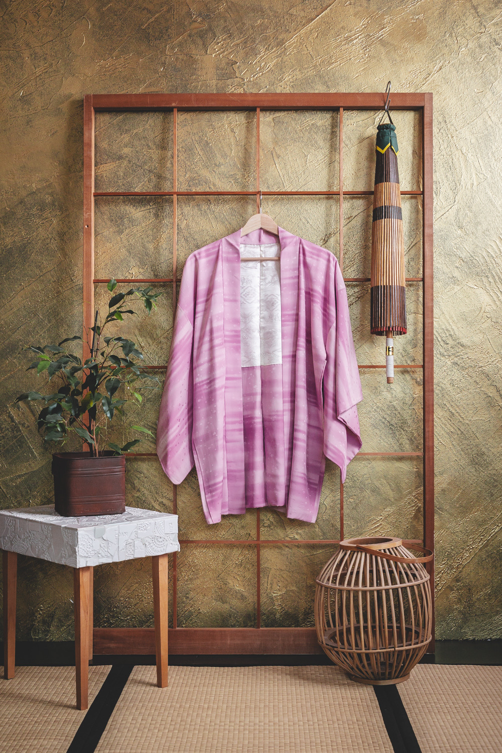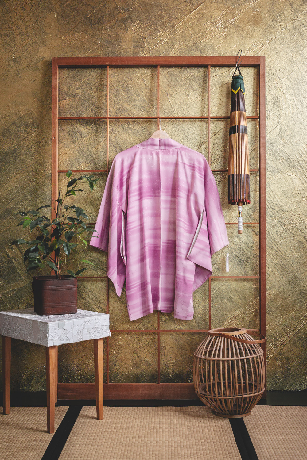 Vaaleanvioletti haori, johon on värjätty pehmeän usvamainen raitakuvio. Kankaaseen on lisäksi kudottu täpläkuvio. Kangas on pehmeää ja sileää. Haorissa on valkoinen vuorikangas, johon on kuvattu maisemia ja geometrisiä kuvioita.
