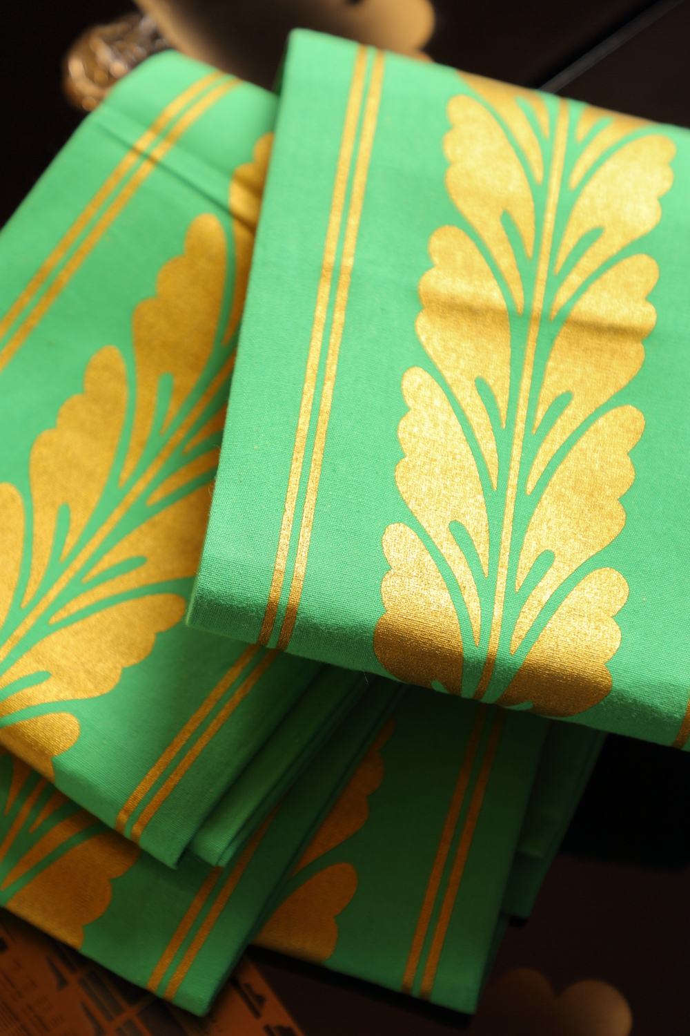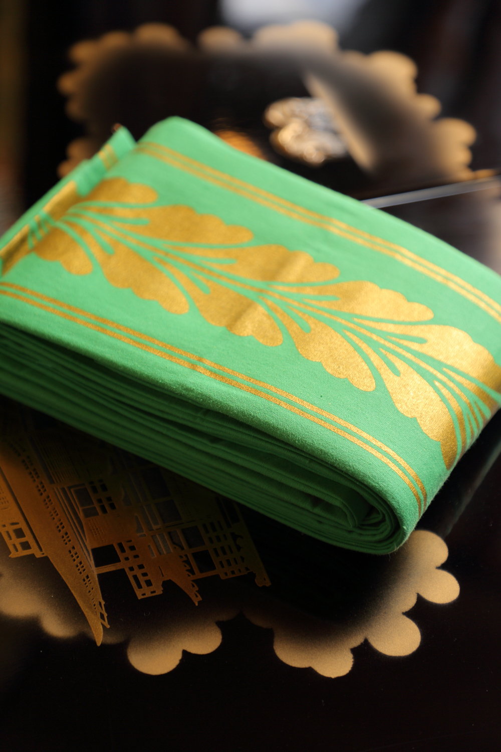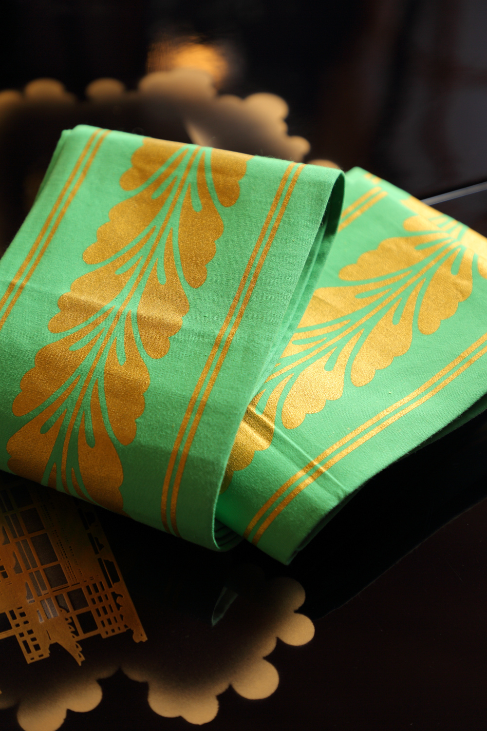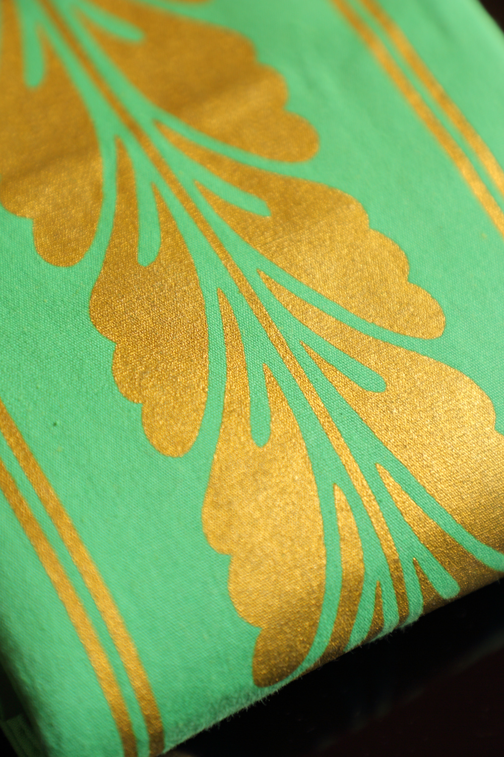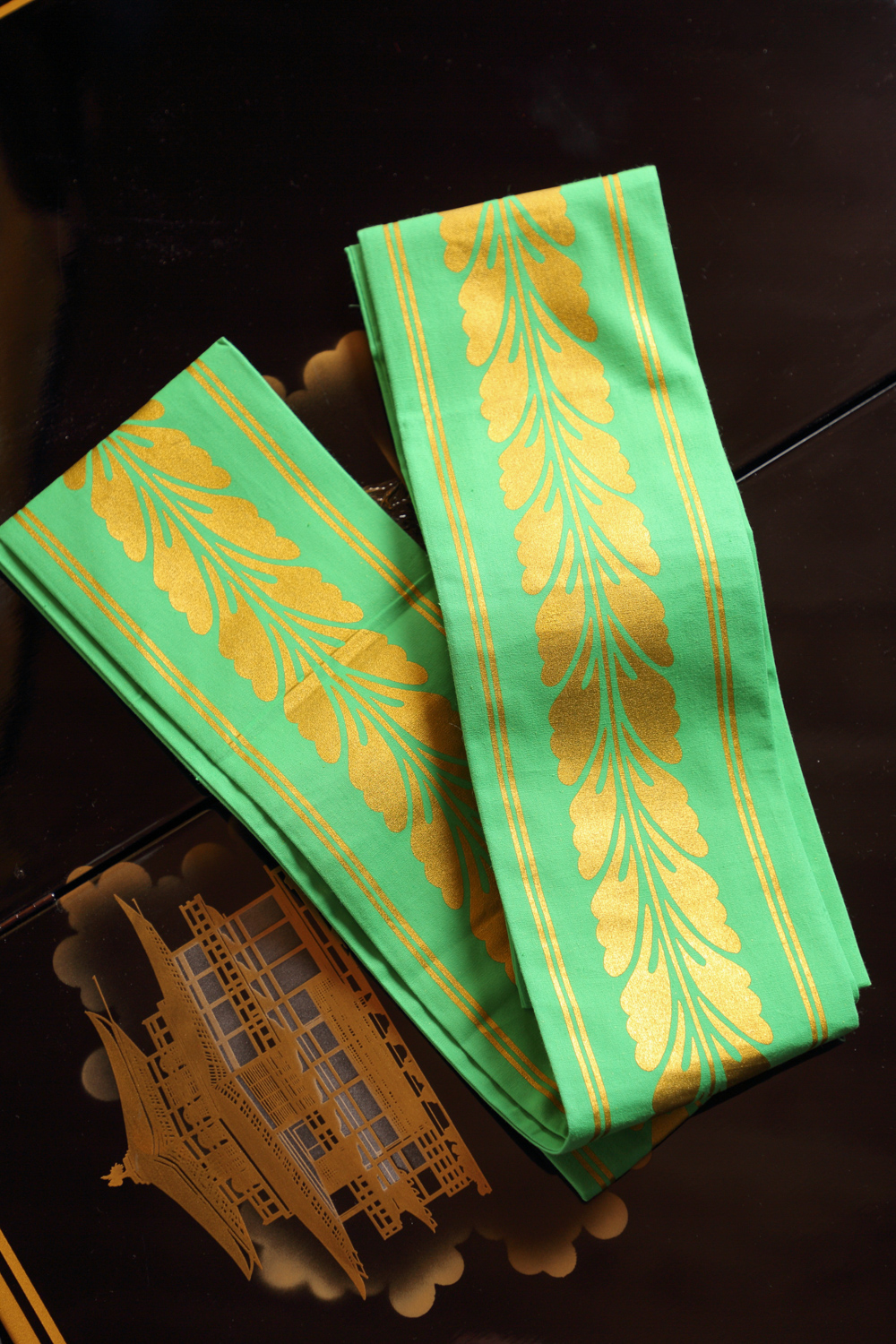 Heleän vihreä hanhaba-obi, johon on painatettu kultainen köynnöskuvio. Obin kääntöpuoli on yksivärinen vihreä. Vyössä on sisällä jäykkä tukikangas, joka tekee vyöstä napakan.