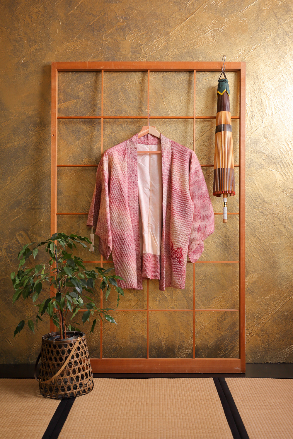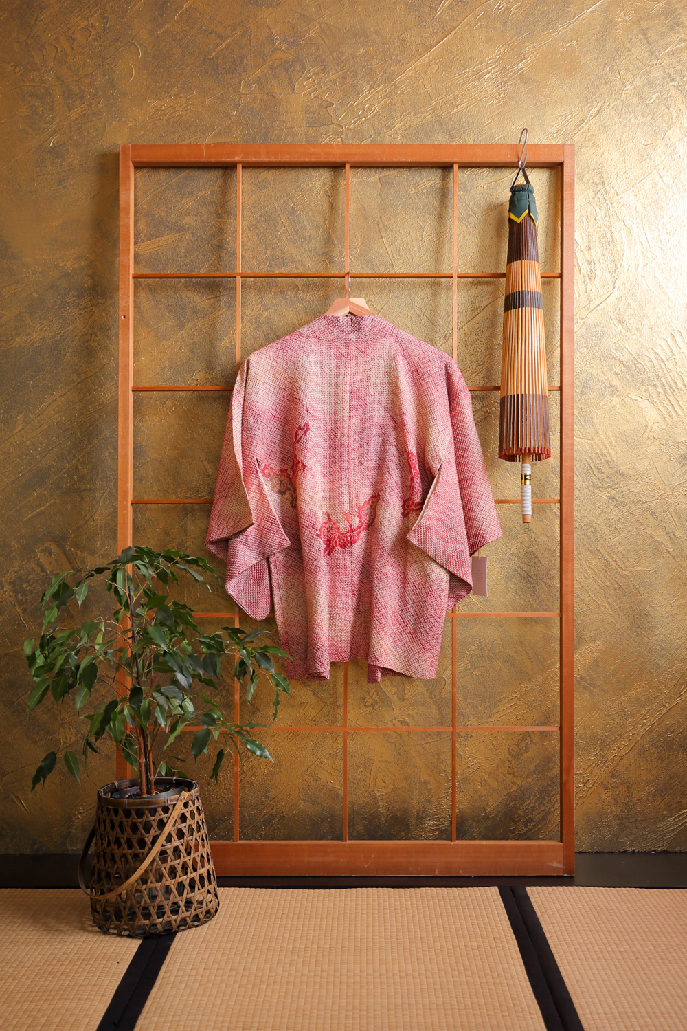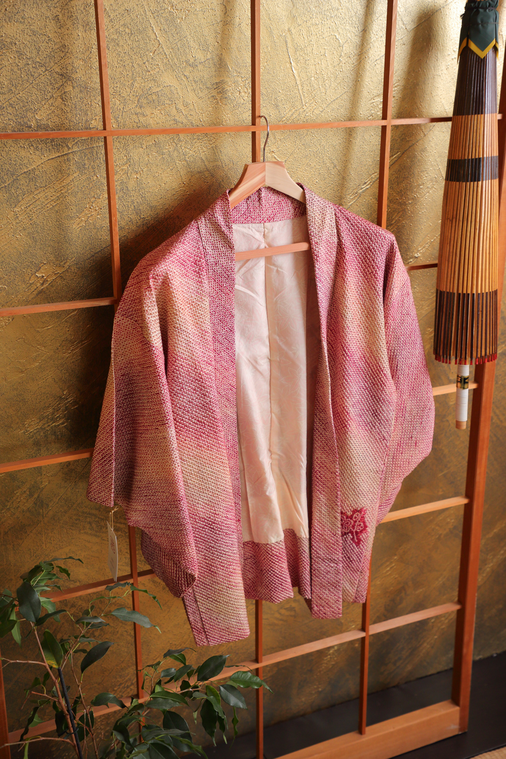 Viininpunaisen ja vihreän eri sävyissä läikähtelevä solmuvärjätty haori, johon on kuvattu kukkivia luumupuun oksia. Kangas tuntuu pehmeältä ja kuohkealta. Haorissa on vaaleanpunainen vuorikangas, jossa on valkoinen kukka- ja lehtikuviointi.