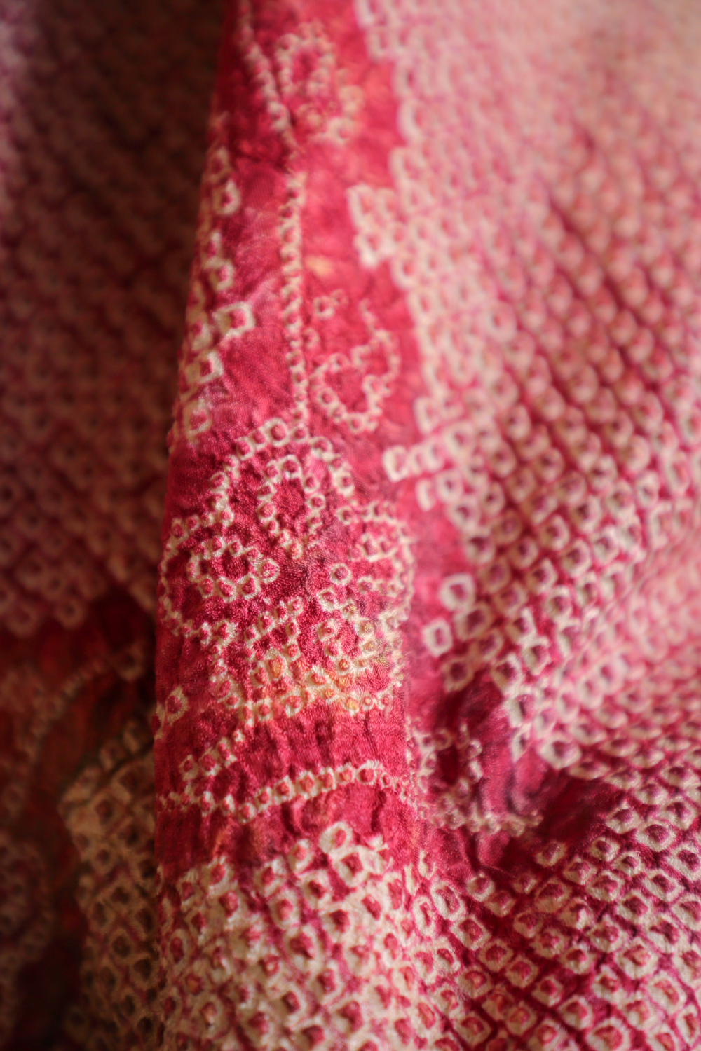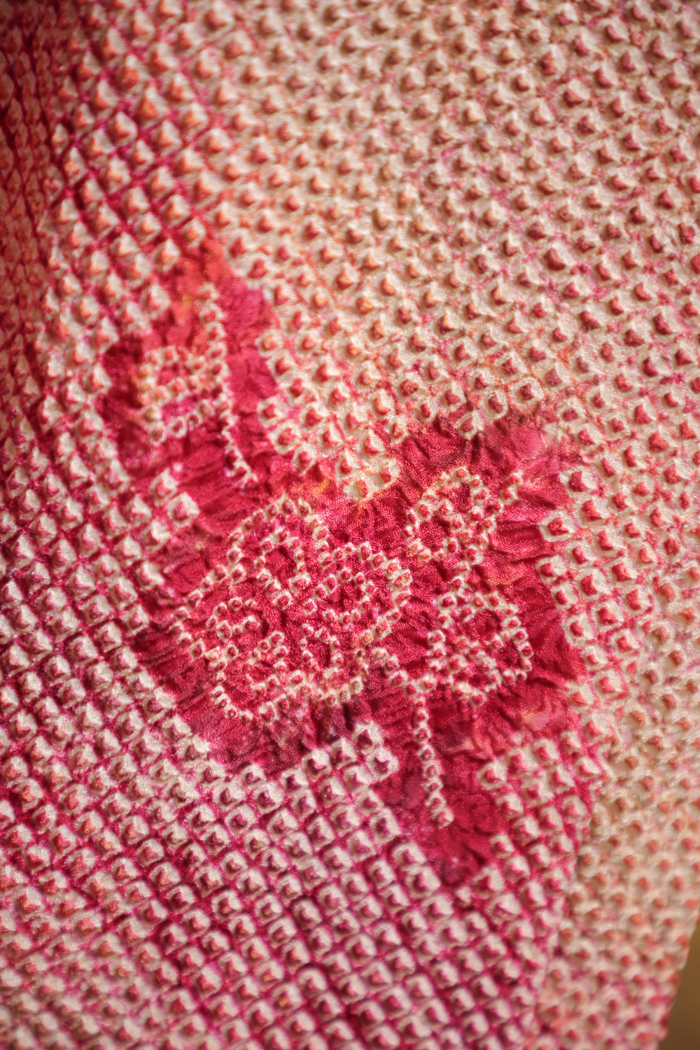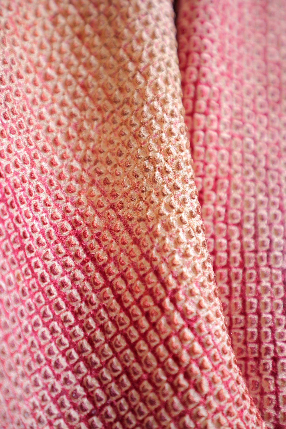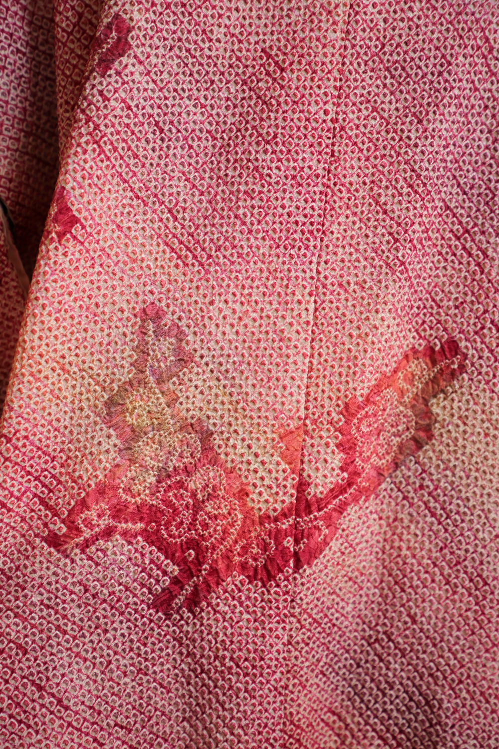 Viininpunaisen ja vihreän eri sävyissä läikähtelevä solmuvärjätty haori, johon on kuvattu kukkivia luumupuun oksia. Kangas tuntuu pehmeältä ja kuohkealta. Haorissa on vaaleanpunainen vuorikangas, jossa on valkoinen kukka- ja lehtikuviointi.