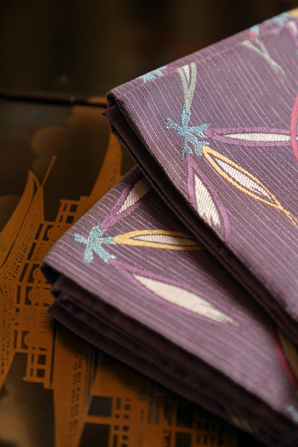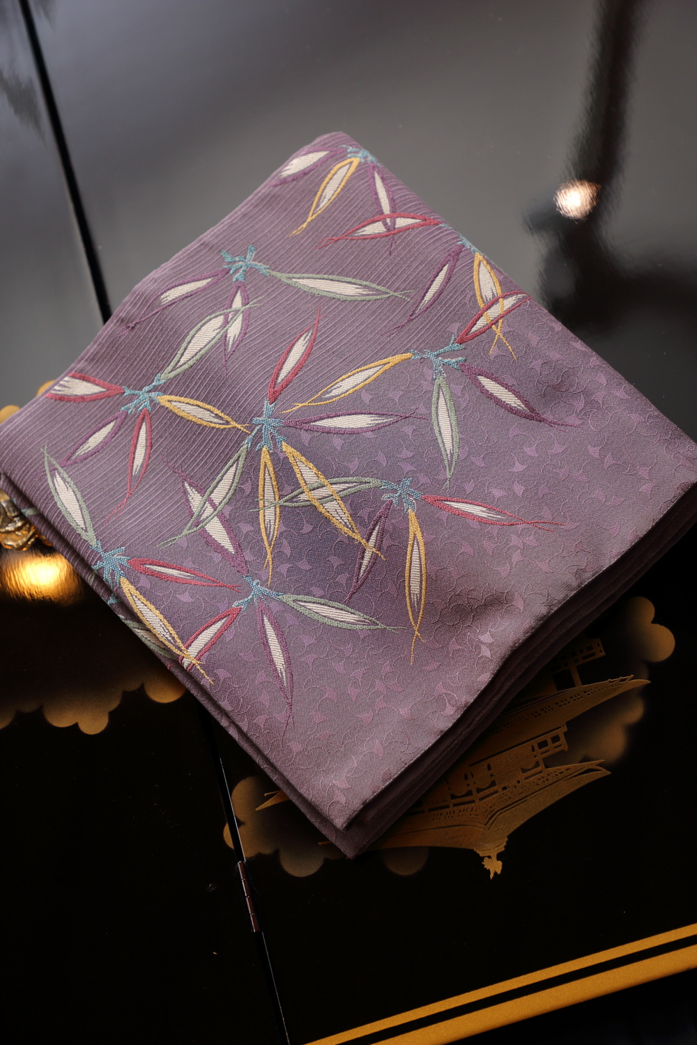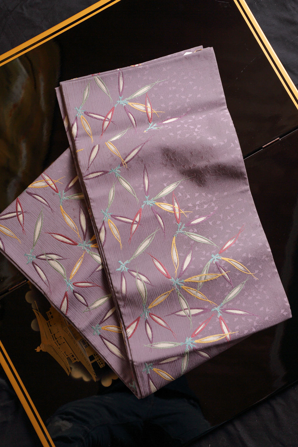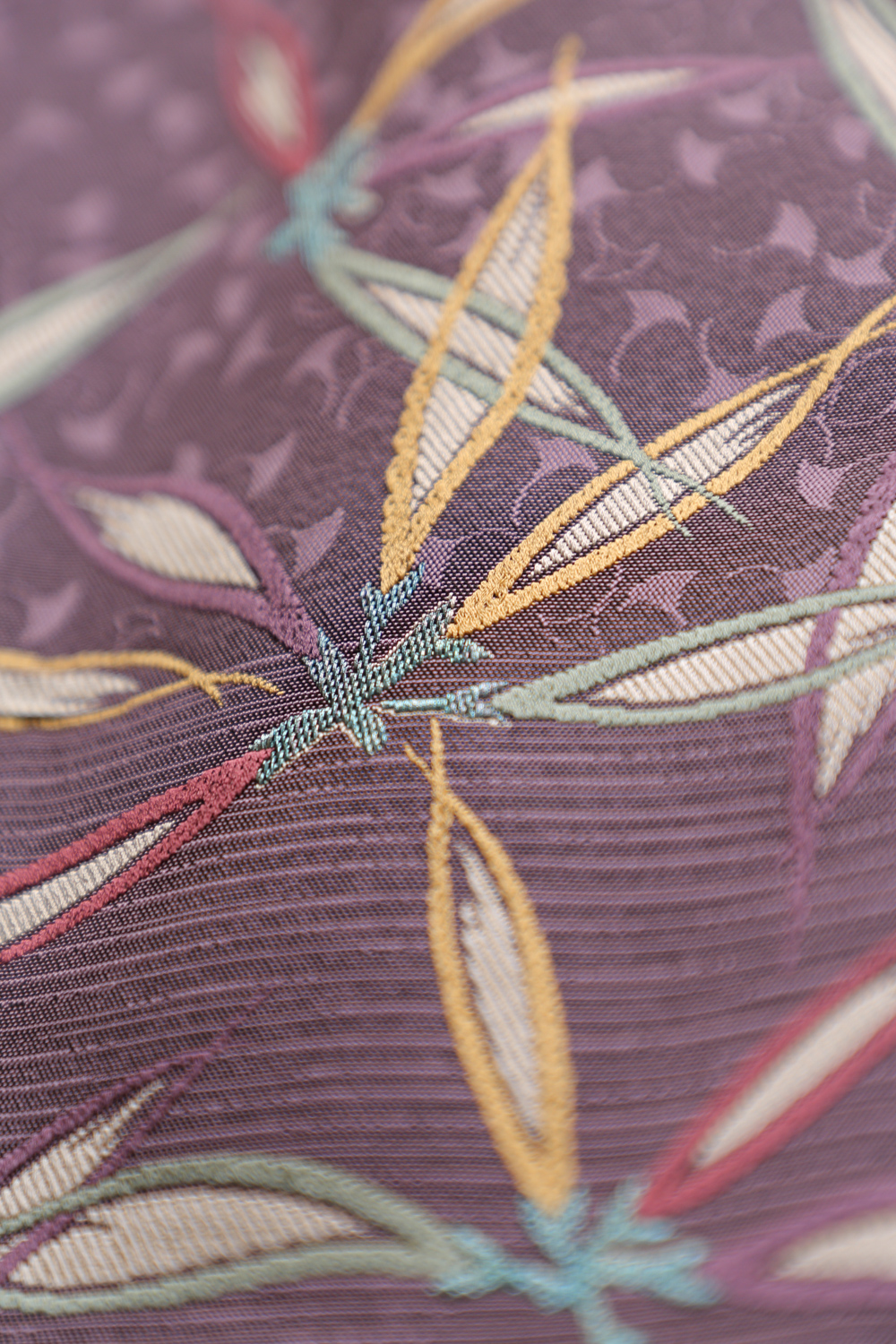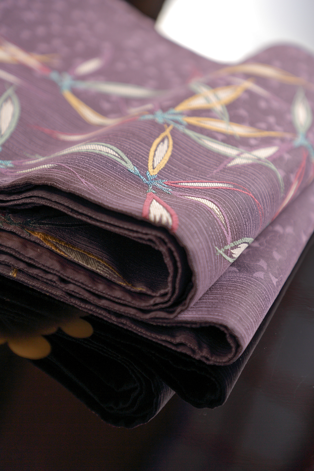 Murretun violetti fukuro-obi, johon on kuvattu abstrakteja kukkia violetin, keltaisen, mintunvihreän ja viininpunaisen sävyissä. Obin pohjalle on kudottu raita- ja kasvikuvio. Obissa on fukuro-obeille tyypillinen kuvioimaton osuus, joka jää puettaessa näkymättömiin. Obin kääntöpuoli on violettia, yksiväristä kangasta.