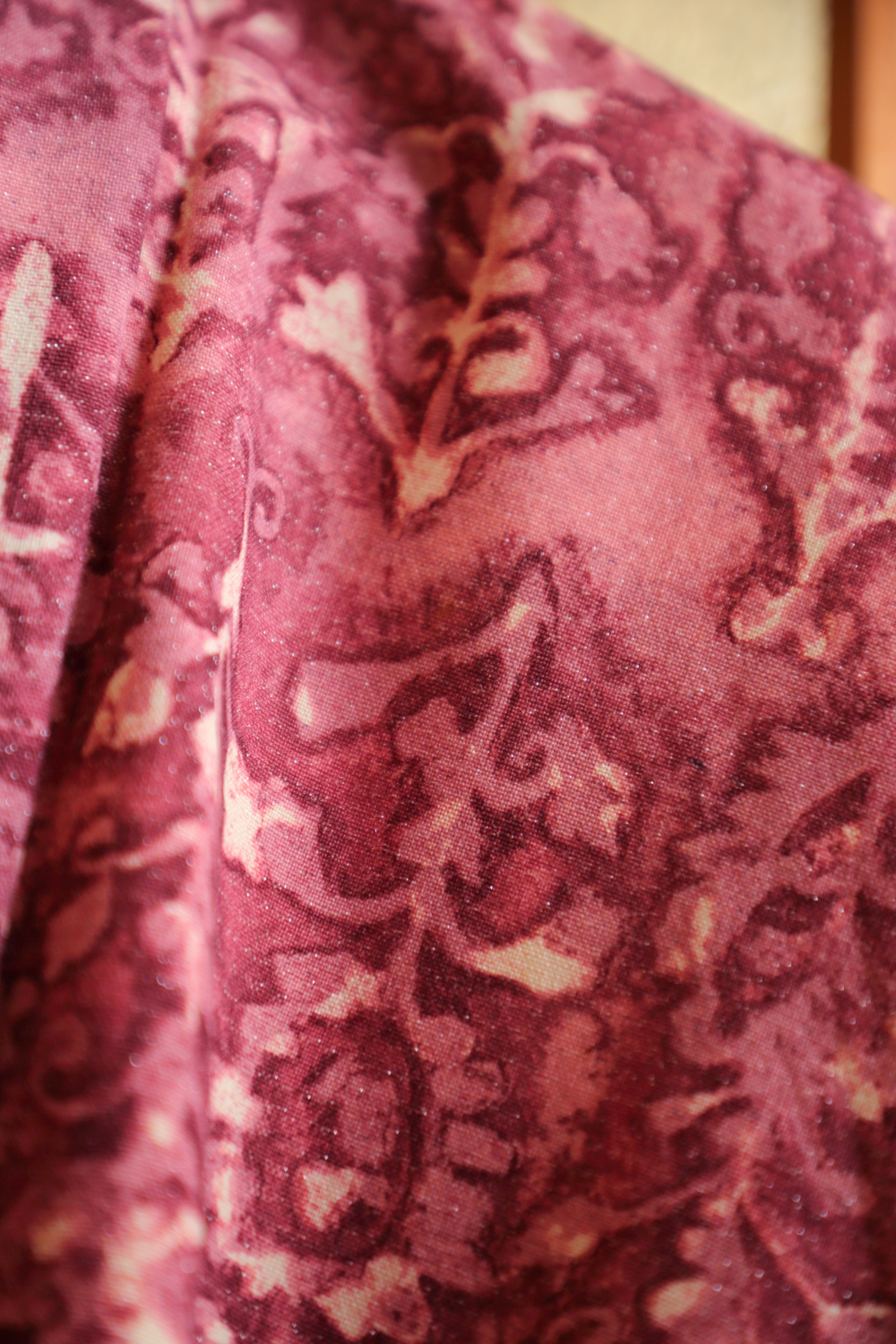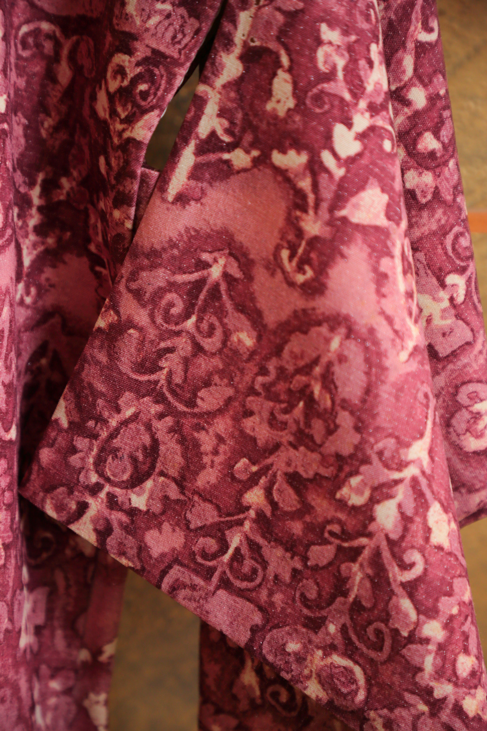 Violetti haori kukkia muistuttavalla ornamenttikuviolla. Kankaaseen on kudottu hopealankaa, joten haori kimaltaa tyylikkäästi hieman. Kangas tuntuu pehmeältä ja mukavalta. Vaaleanpunaiseen vuorikankaaseen on kuvattu perhosia.